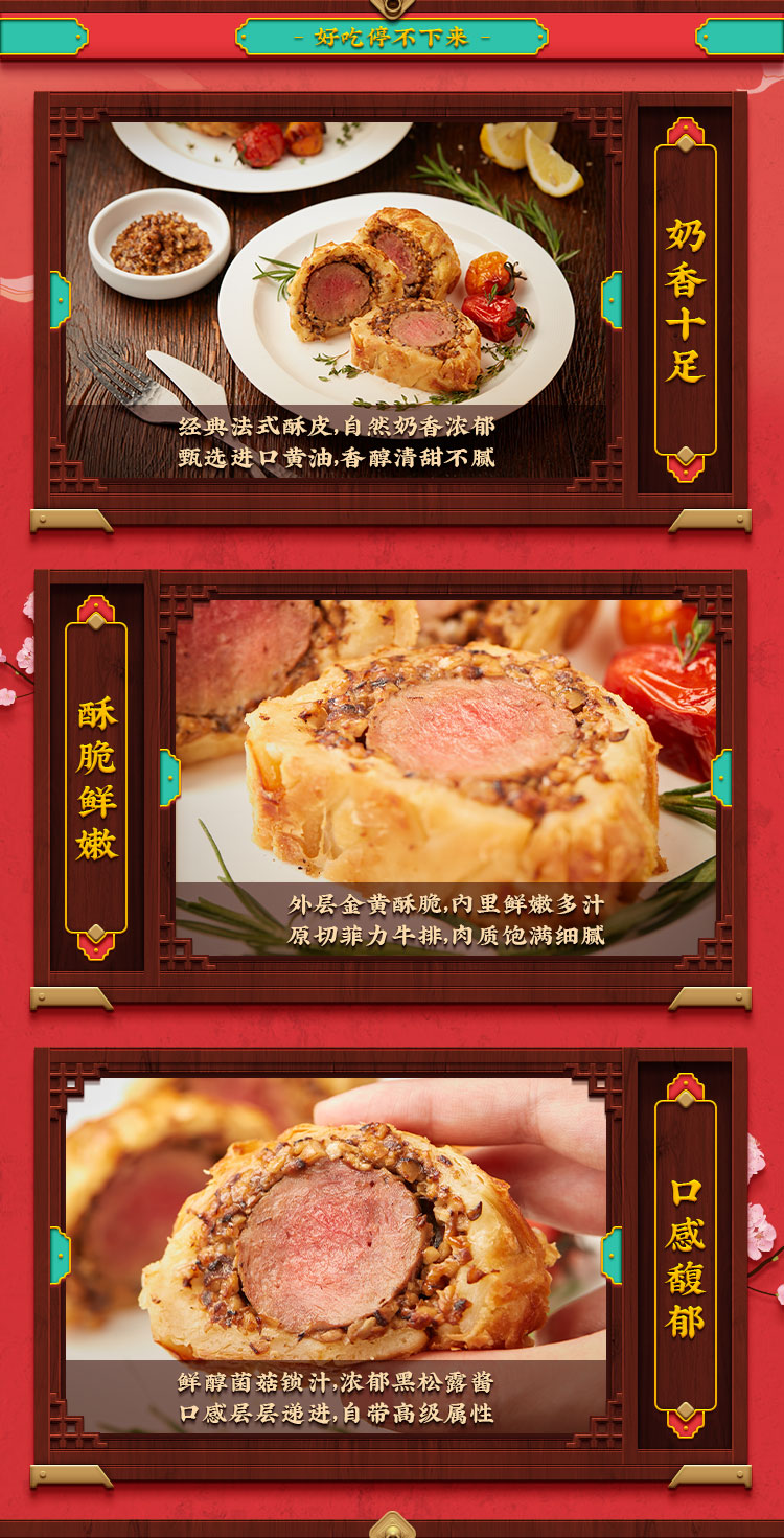 这款 珍味小梅园 惠灵顿酥皮牛排,规格: 270g*5块,内里为菲力牛排肉,中间夹了黑袍蘑菇、黑松露酱,外层为烤制金黄的外皮,色泽诱人,肉质紧实饱满,唇齿留香。