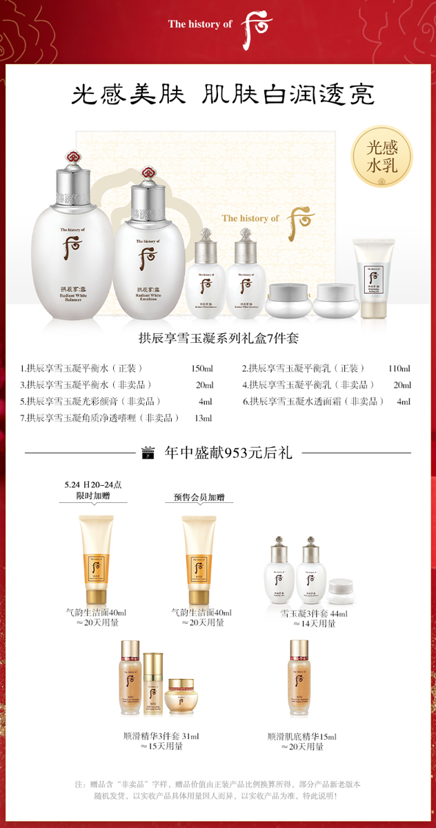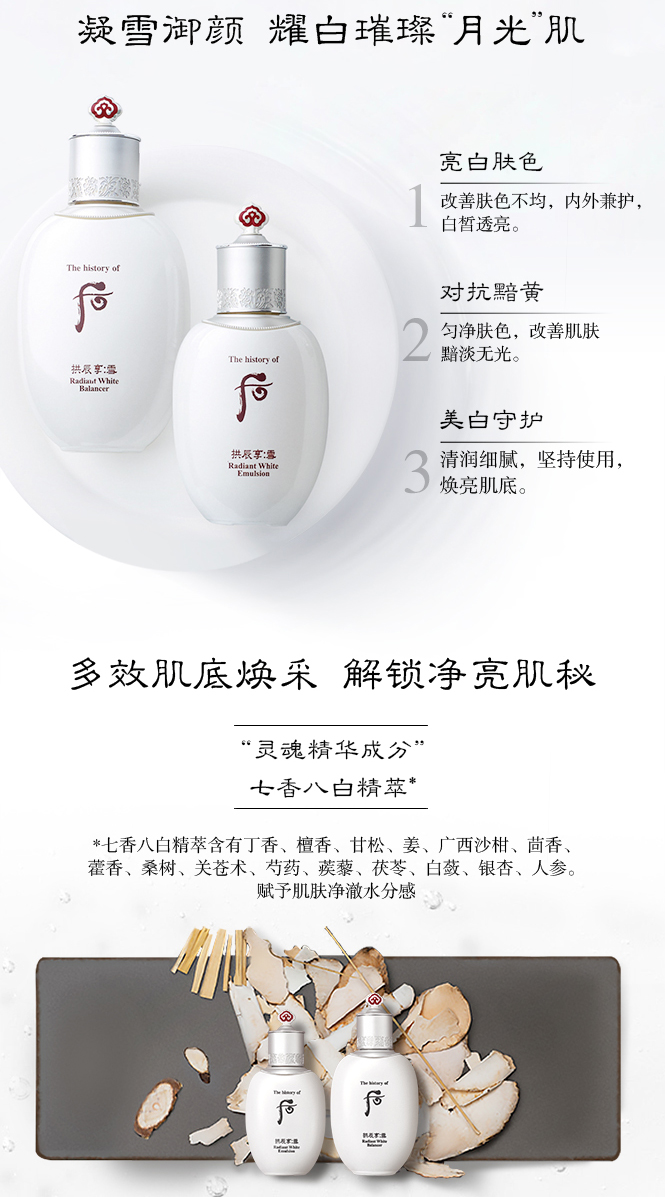 拱辰享雪水凝系列是针对各个原因引起的色素沉淀实现美白的,用到了LG全球专利全新美白成分:“甘菊萃取物”,将七香、八白散与天然菊花精心熬出后时行低温熟成的甘菊水渗入皮肤,使皮肤如白玉般晶莹剔透。