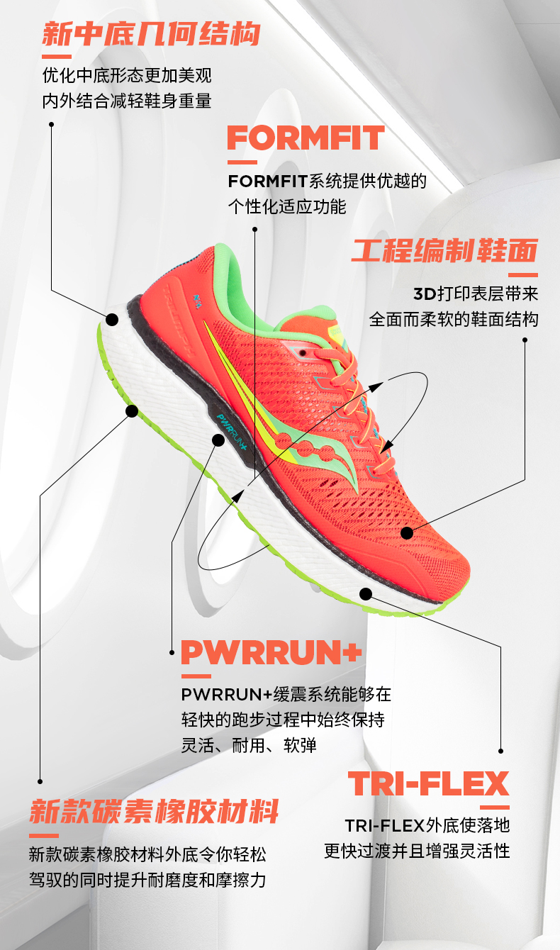 大底:使用TRI-FLEX新款碳素橡胶材料,令你轻松驾驭的同时,提升耐磨度和摩擦力,落地更快过渡并且增强灵活性,同时助力跑者跑得更快。