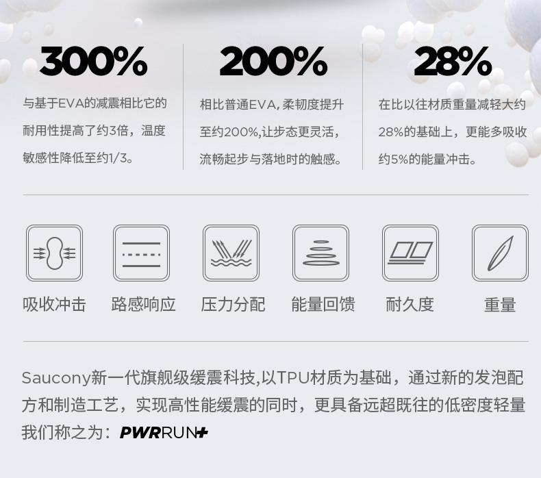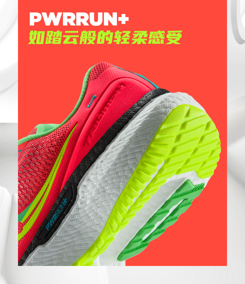 中底:PWRRUN+材质,提供更好的灵活性、耐久性和回弹性,重量减轻25%,并且采用新的中底几何形状,助力跑者跑得更快,感受如踏云般的感受。