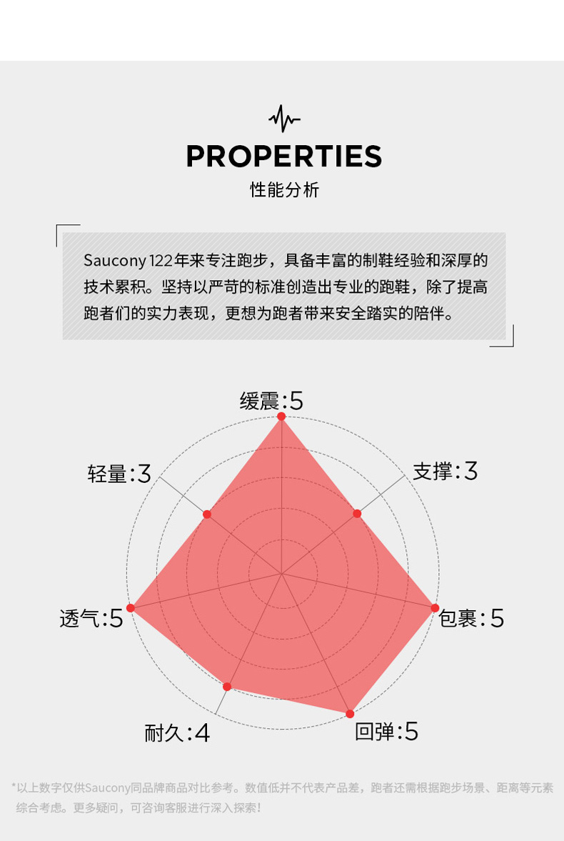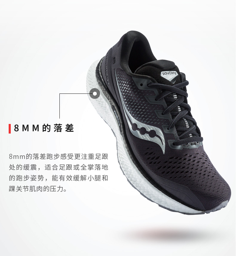 前掌厚度:24.5MM,后掌厚度:32.5MM,鞋重315克,8MM的高度落差,更注重足跟处的缓震,适合足跟或者全掌落地的跑步姿势,能有效缓解小腿和踝关节肌肉的压力。