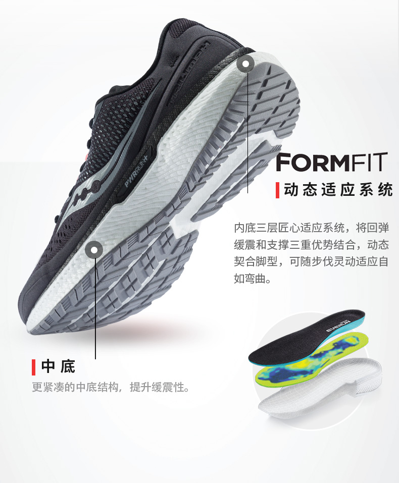 内底:FORMFIT 动态适应系统,提供奢华的定制贴合感和适应性功能,将回弹、缓震和支撑三重优势结合,动态契合脚型,可随步伐灵动适应,自如弯曲。