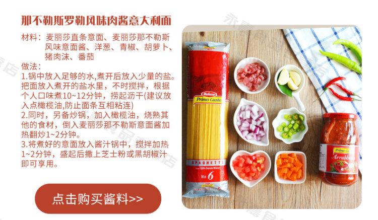 制作方面也很简单方便,无需复杂配方,只需煮熟搭配各种口味的意面酱,点缀一些水果蔬菜,一盘完美的意大利面便制作完成了。规格:500g*3袋 可供15人食用。