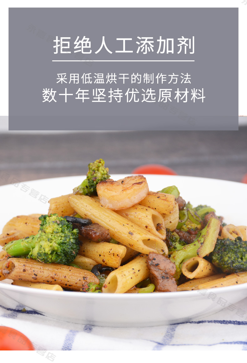 以杜兰小麦为原料,这个品种属于硬质小麦,具有高密度、高蛋白质、高筋度等特点,采用低温烘干健康无添加,做成的意大利面呈金黄色,耐煮、面质软弹,口感劲道爽滑,其中每100g含蛋白质12g、脂肪1.5g、不仅可以满足人们所需营养,还可以增加长时间的饱腹感,适合所有人群食用。