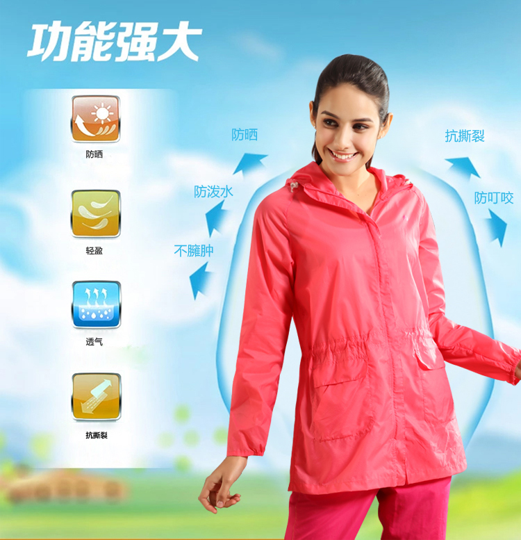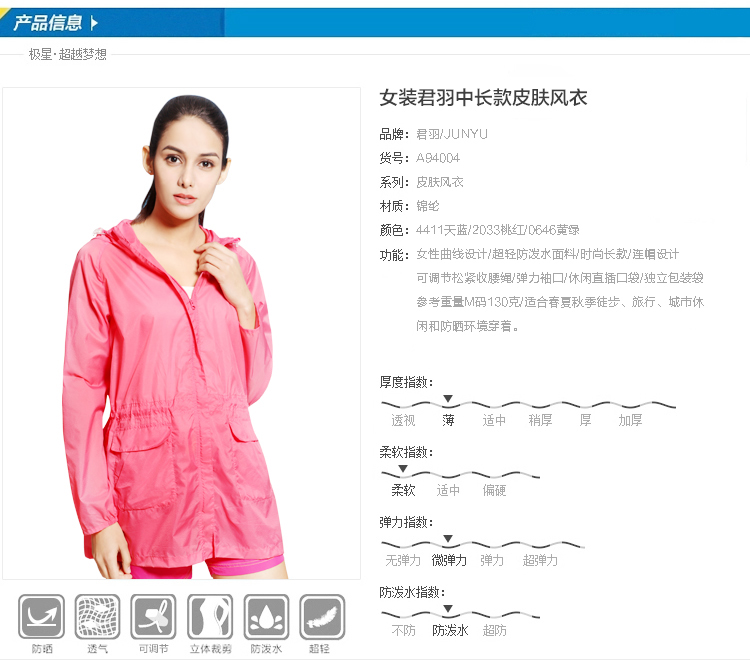 这款君羽女皮肤风衣,款式上是很少见的中长款,比较时尚,面料是靠谱的超细尼龙纤维,非常轻薄,完美兼容美观和实用。