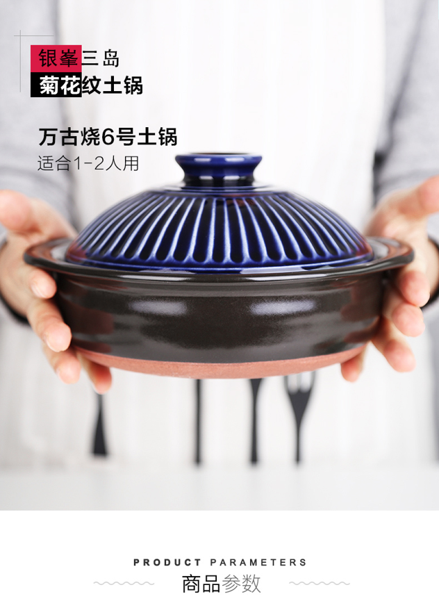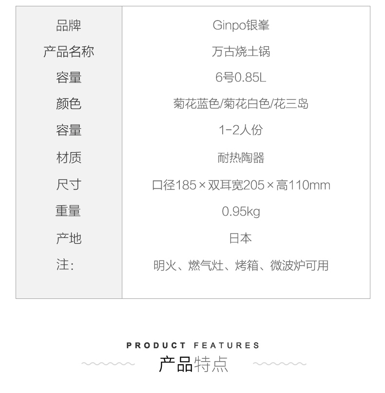 这款日本进口GINPO 银峯 万古烧 6号菊花纹土锅,日本产,煮饭、煲汤煮粥均可。万古烧土锅具有耐高温、热效率高、保温性良好的优点,最重要的是颜值高的同时,不含重金属,使用起来更加安全放心。尺寸:口径185×双耳宽205×高110mm,重约950kg,容量约为0.85L,明火、燃气灶、烤箱、微波炉皆适用。