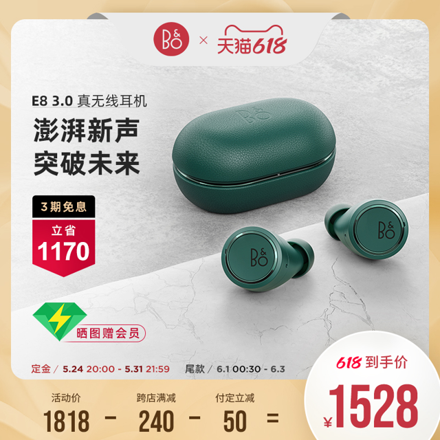 天猫B&O海外旗舰店该产品预售价1818元,需付定金100元立减50元,6月1日0点30分支付尾款,叠加参与跨店减免240元优惠活动,到手价1528元包邮。蓝牙5.1无线,支持aptX协议,35小时强劲续航。感兴趣的买买不要错过~