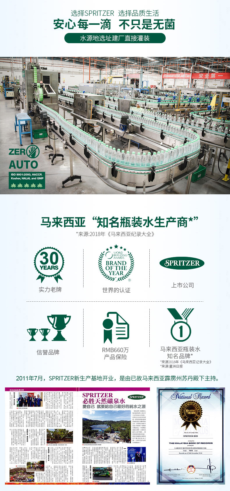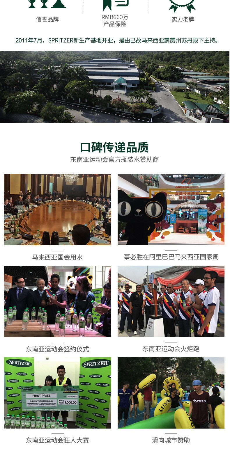 Spritzer创建于1989年,是马来西亚瓶装水第一生产商「官网在此」,是马来西亚国会、东南亚运动会指定用水品牌,连续6次荣获国际风味暨品质评鉴所(iTQi)认可,颁予顶级美味奖章(Superior Taste Award)里的最高荣誉,以荣获90%或以上的佳绩,被列入三星美味的级别。连续4年被马来西亚纪录大全收录。