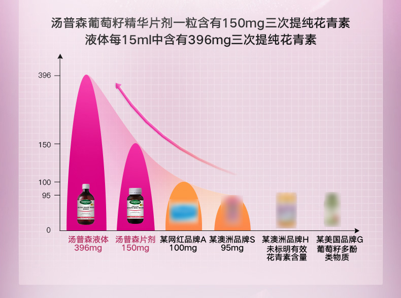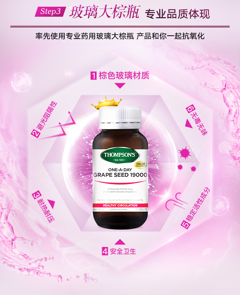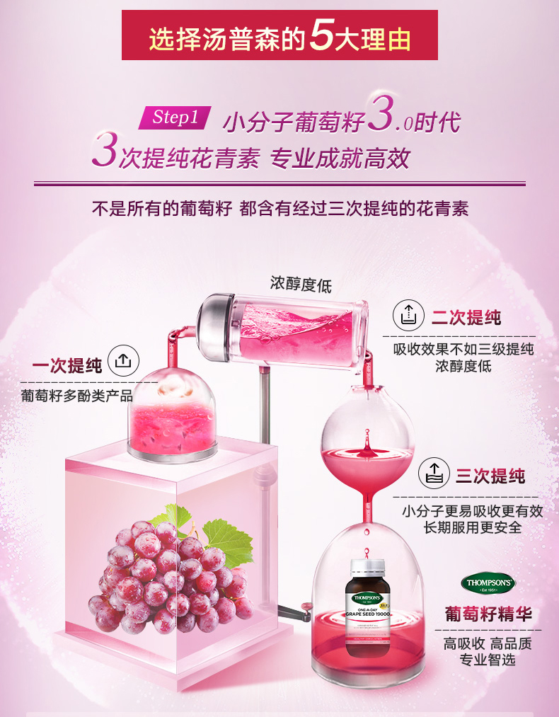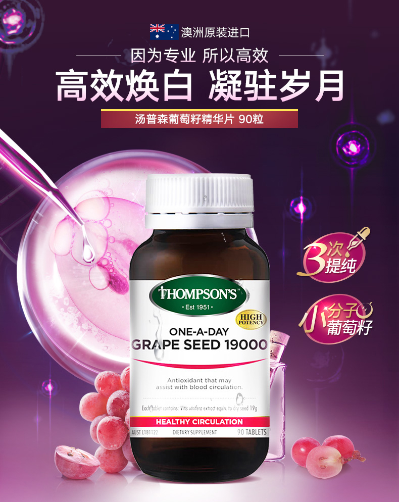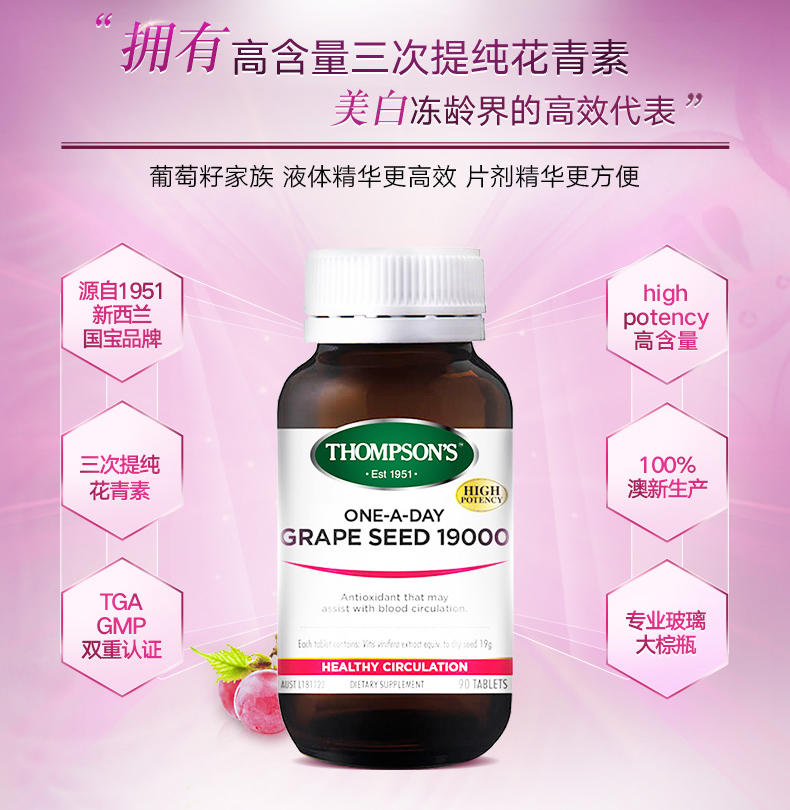 含葡萄籽精华量最高的一款天然抗氧化产品,每粒胶囊提供19000mg葡萄籽精华,150mg原花青素(OPC),可清除体内的自由基,营养皮肤、增强皮肤免疫力。