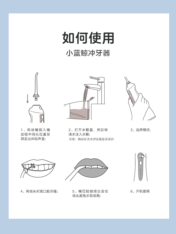 美的这款小蓝鲸 冲牙器水箱容量有240ml,比常规产品水箱容量要高出20%,接一次水就能把牙缝冲干净,不用中途再加水。独特的重力球设计,可以实现万向供水。无论你竖着拿、斜着拿还是倒着拿,都没问题。这样就便于从不同角度深入清洁口腔内侧,包括智齿、后槽牙这些位置,都不会成为清洁死角。