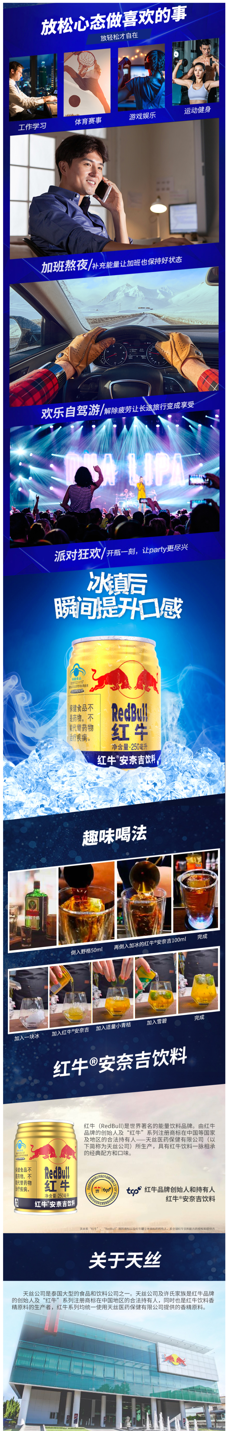 Red Bull 红牛是全球首先推出且被人熟知的的能量饮品之一。内含水、糖、咖啡因、muco-纤维醇和维生素B等成分的“滋补性饮料”,特别添加西洋参提取物,补气益脑,提神抗疲劳,熬夜加班、长途驾驶、运动健身补充能量。
