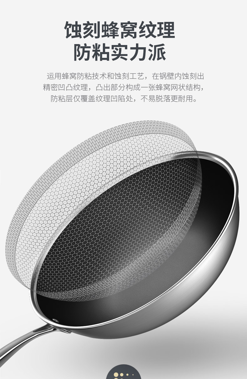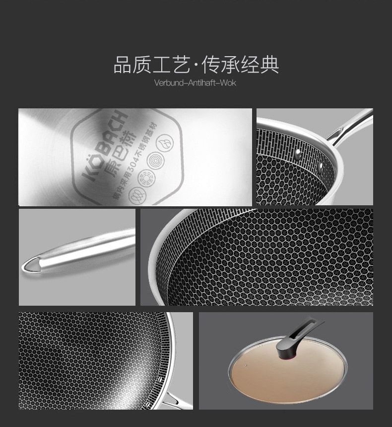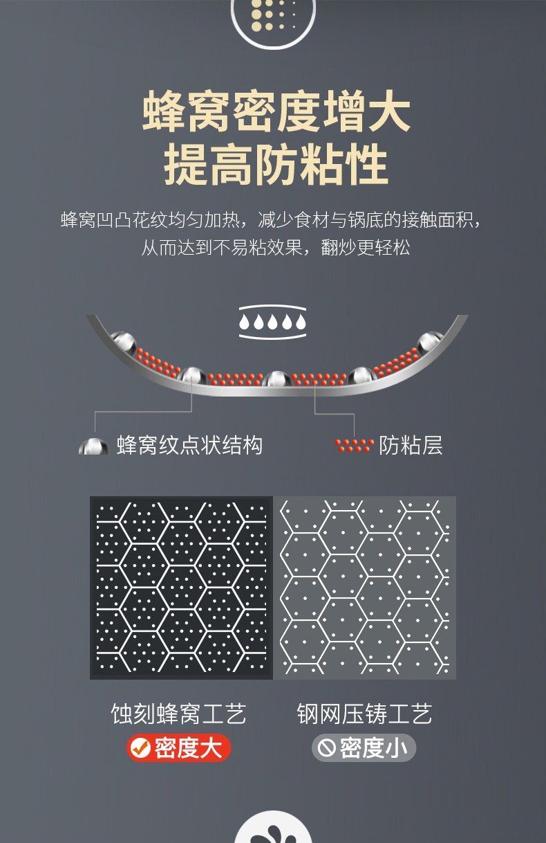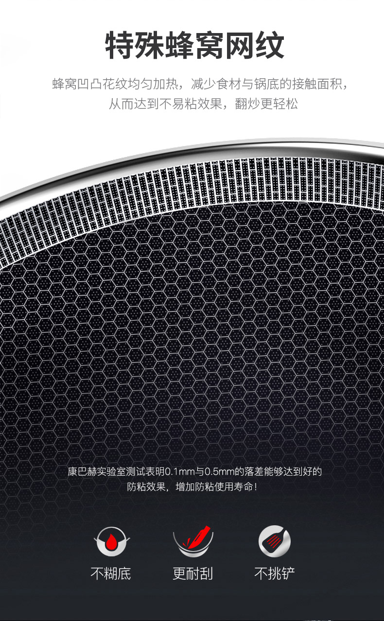 这款康巴赫不粘锅,采用了比C级老款半屏更高的E级全面不粘技术,实现锅内的全方位防粘。锅身是包括食品级304不锈钢在内的,共五层冲压,一体成型设计,更为牢固耐用。其中,锅内的蚀刻不粘工艺实现了蜂窝纹理全面覆盖,大幅度提高不粘特性,且少油烟,锅底不易发黄、不怕剐蹭,一擦即净,方便清理。