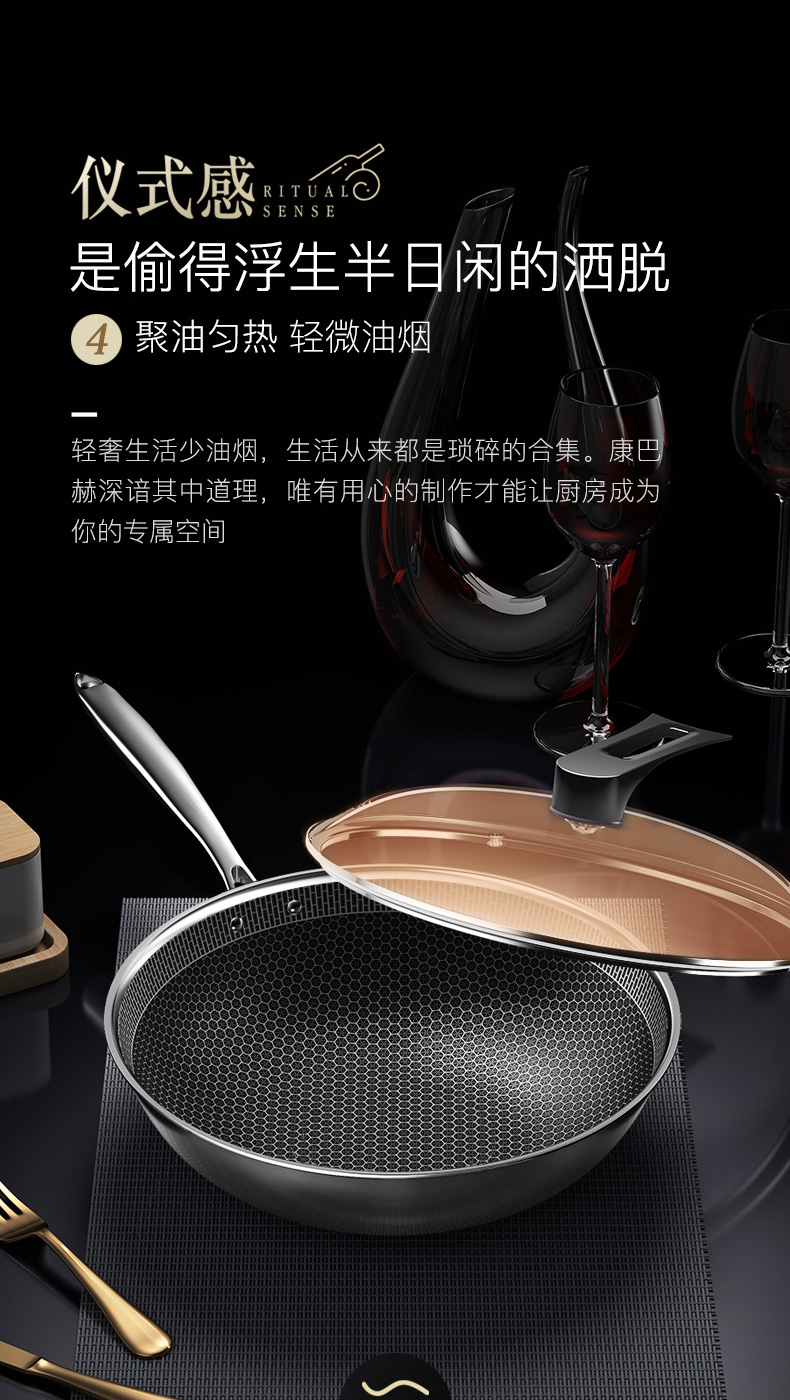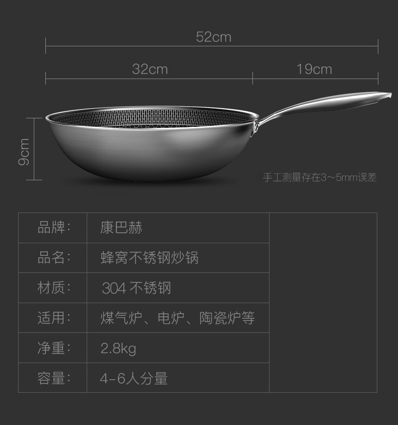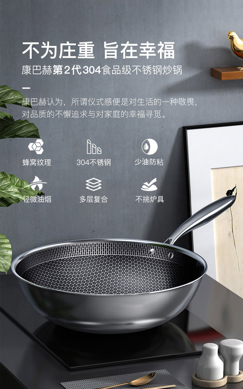 这款康巴赫不粘锅,采用了比C级老款半屏更高的E级全面不粘技术,实现锅内的全方位防粘。锅身是包括食品级304不锈钢在内的,共五层冲压,一体成型设计,更为牢固耐用。其中,锅内的蚀刻不粘工艺实现了蜂窝纹理全面覆盖,大幅度提高不粘特性,且少油烟,锅底不易发黄、不怕剐蹭,一擦即净,方便清理。