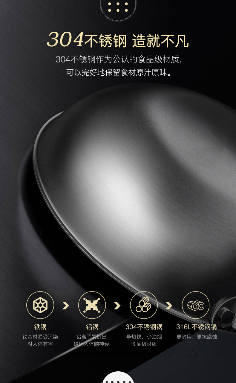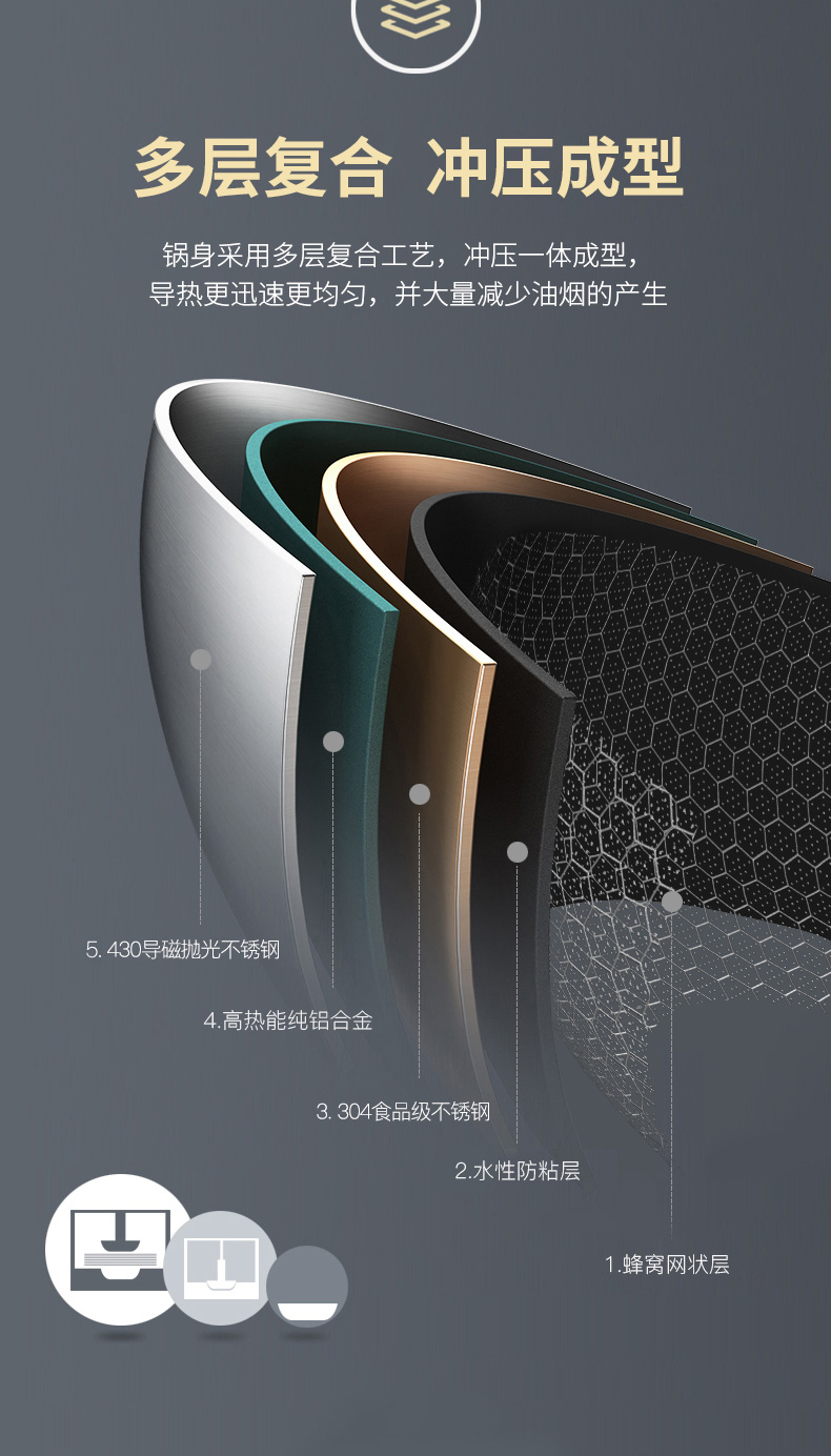 五层冲压一体成型的锅底,升温迅速且均匀,不挑炉灶,燃气灶、电磁炉等都适用。8.5cm锅深设计,平时做饭的煎炒蒸煮都能实现。把手与锅身为加固铆钉,内里的固定处光滑设计,不易藏污纳垢,冲洗迅速,也保证坚固耐用。