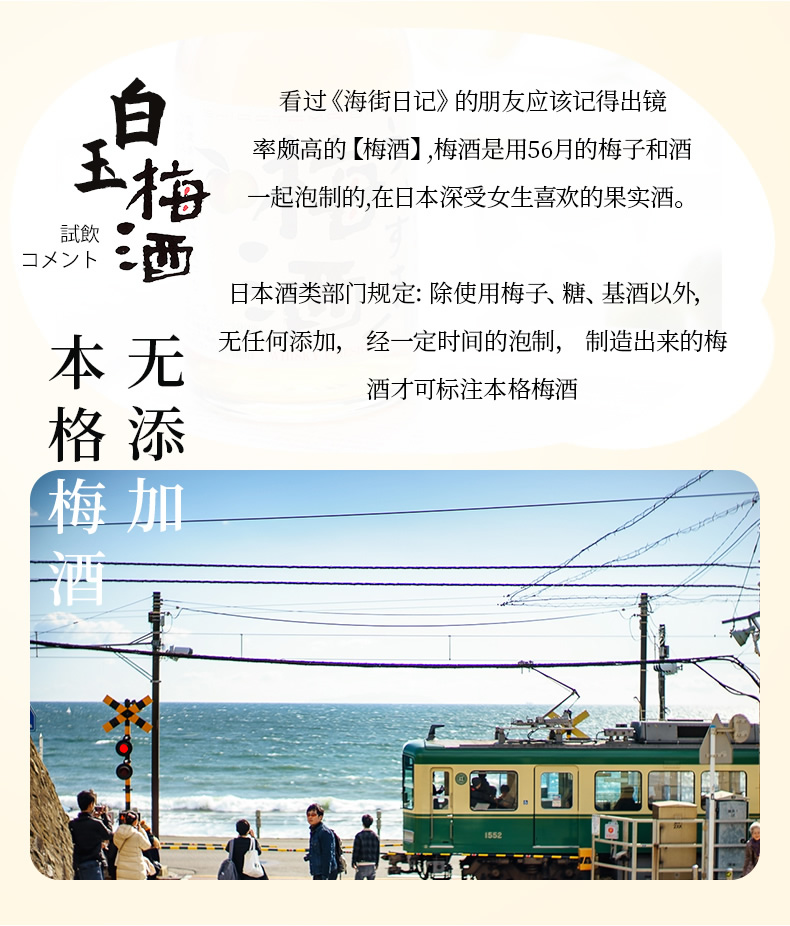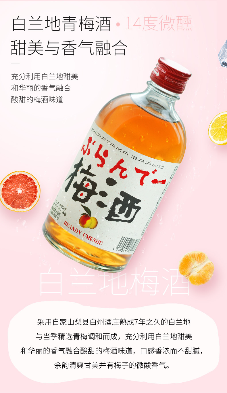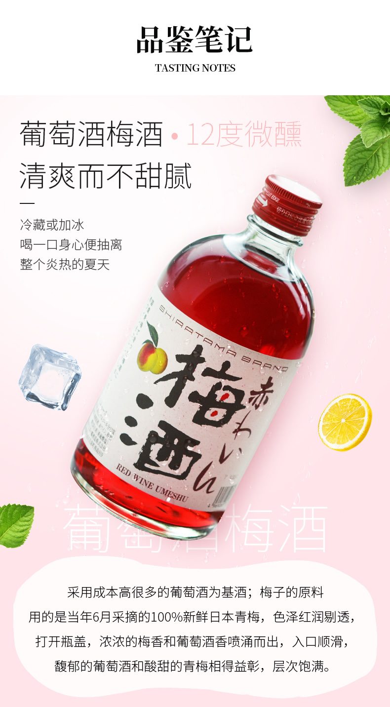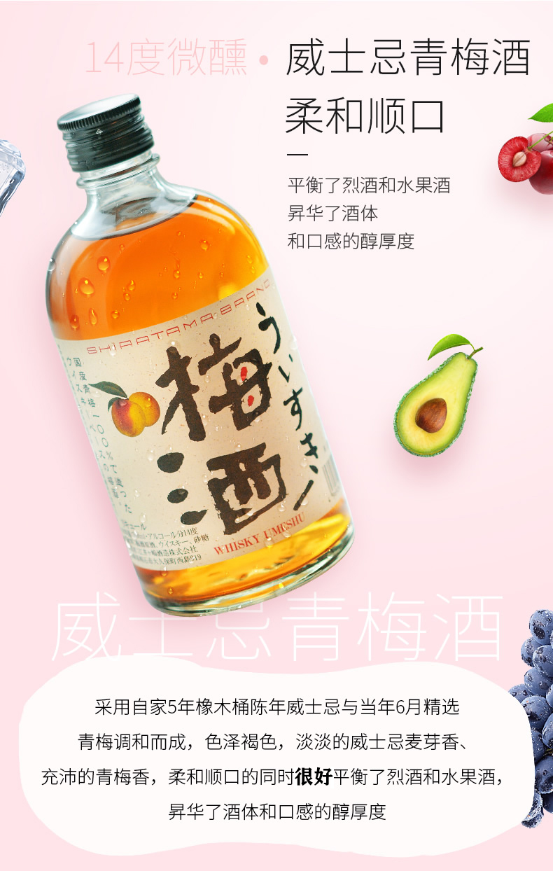 特别适合女生喝的梅子酒,看过《海街日记》的童鞋应该记得出镜率颇高的梅酒,在日本深受女生喜欢的果实酒,这款采用酒厂在山梨县白州的Charmant 酒庄手工酿制的威士忌,再加上精选的当季青梅于自家的烧酒原酒调和而成。 口感香浓而不甜腻,余韵清爽甘美并有梅子的微酸香气。适合加冰,适当的碳酸水饮用。规格:500ml。