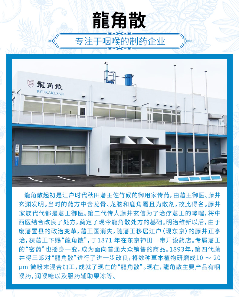 龙角散是由18种草药精华制成,包括薄荷、菊、菩提叶、甘草、麝香草、荔枝草、八角、桉叶、车前子、接骨木花、锦葵、茴芹、蓍草、柠檬香蜂草、枣、金银花、温州橘皮、桔梗。