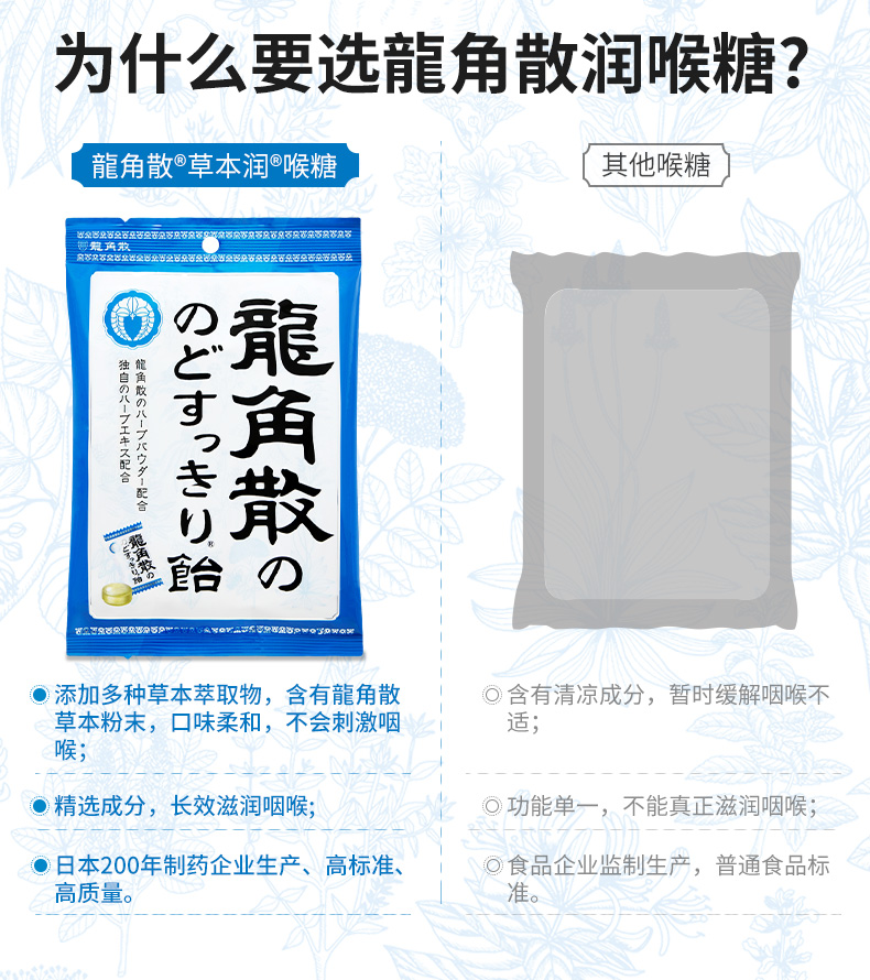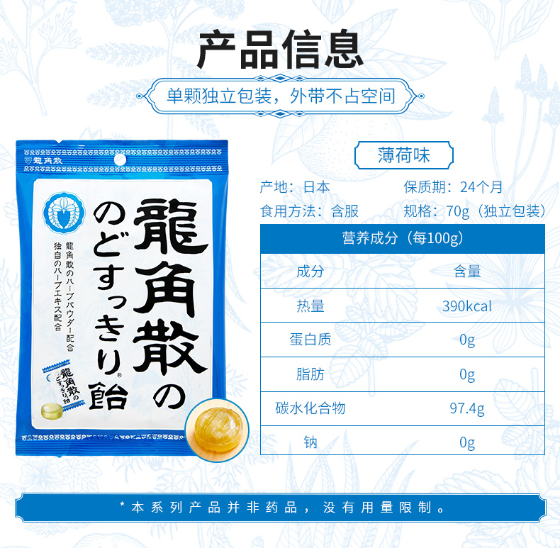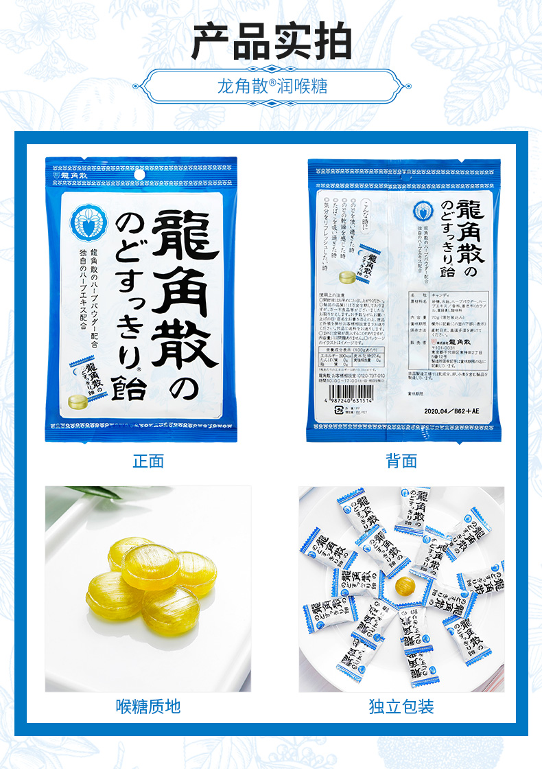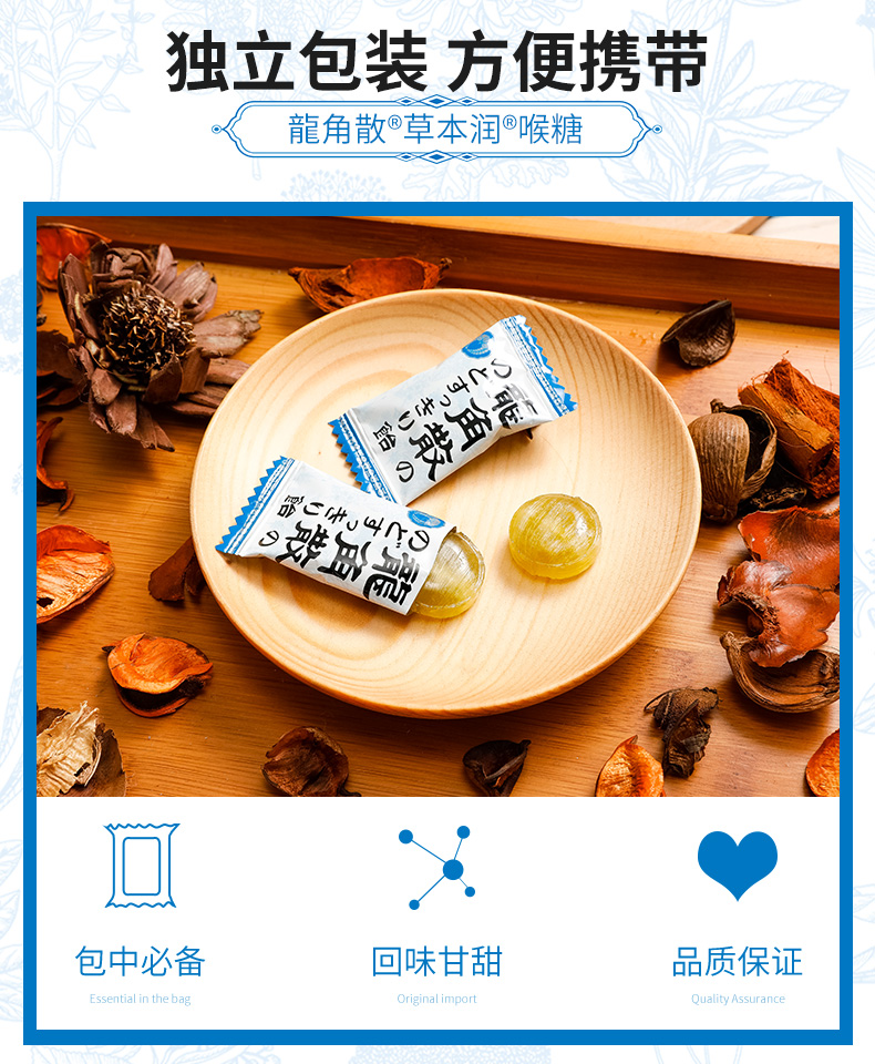特别的龙角散生药配合,100微米细的龙角散粉末包覆于润喉糖的中心,瞬间滋润不适喉咙,对于除痰止咳,清肺、痰多,咽喉肿痛、咽喉炎症有一定的功效,特别是换季的时候,早晚温差大,容易引起长久的干咳和痰咳,家中常备药品,3岁以上宝宝都可以吃。