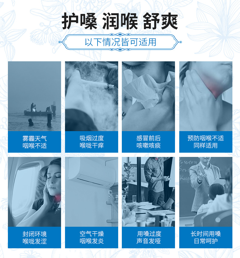 对于感冒引起的喉咙肿痛及吸烟过多导致的嗓子不适,都有显著缓和作用,适用于咽喉不适者、吸烟人群、感冒儿童、教师、户外工作者、KTV麦霸等。