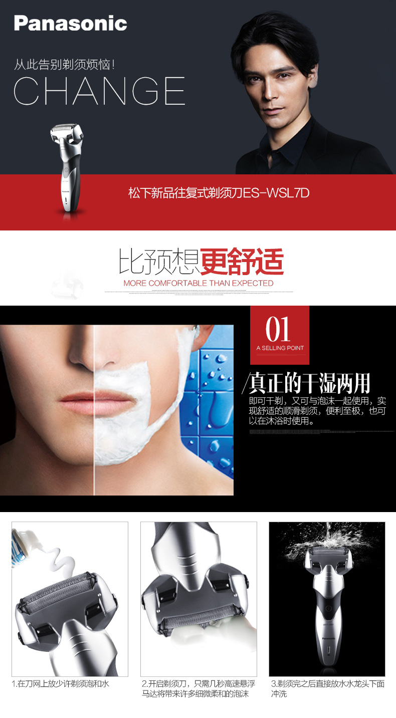 这款松下 SL7D 电动剃须刀,属于金刚侠系列,由三枚垂直刀片组成独立式浮动三刀头,搭配高速磁悬浮马达每分钟13000转的转速,配合30度锐角刀头,能够同时剔除长须和短须,快速剃须; 同时拱形刀网,贴合面部肌肤,灵活剃须,拒绝死角,顺滑剃须;