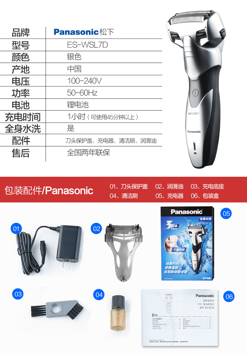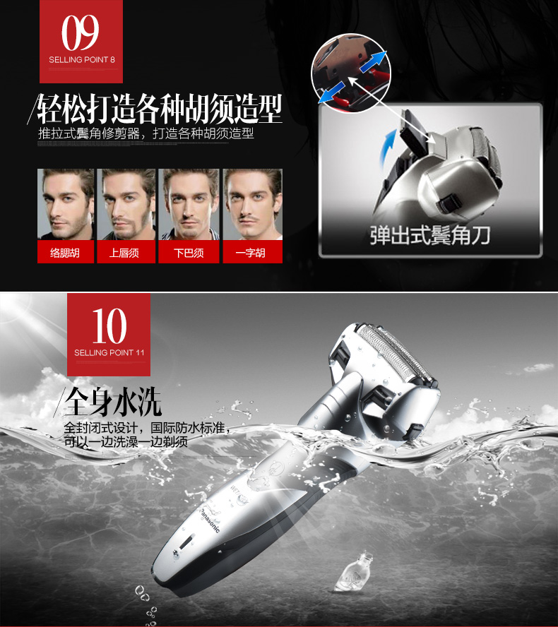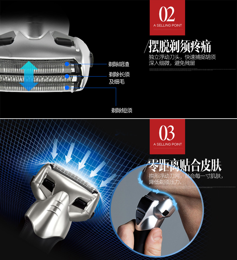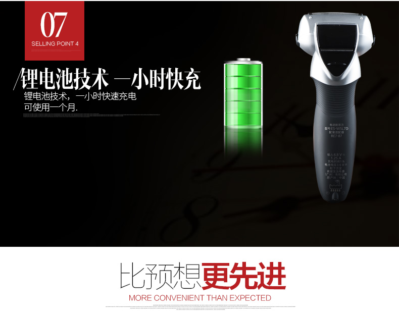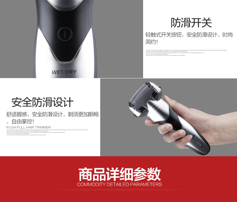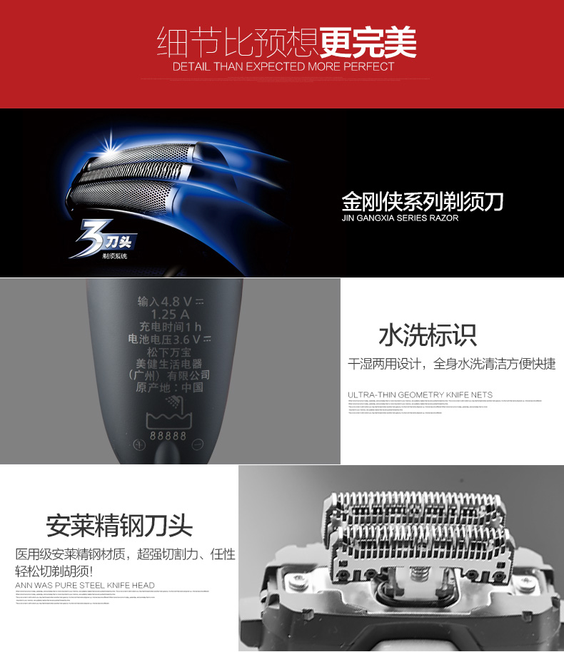 流行形的机身,肌肉造型,动感收腰,完美诠释力与美得结合;整机防水,机身支持直接水洗,干湿两用。内置的锂电池有急速快充,充电5分钟可完成一次剃须,满电需1小时。