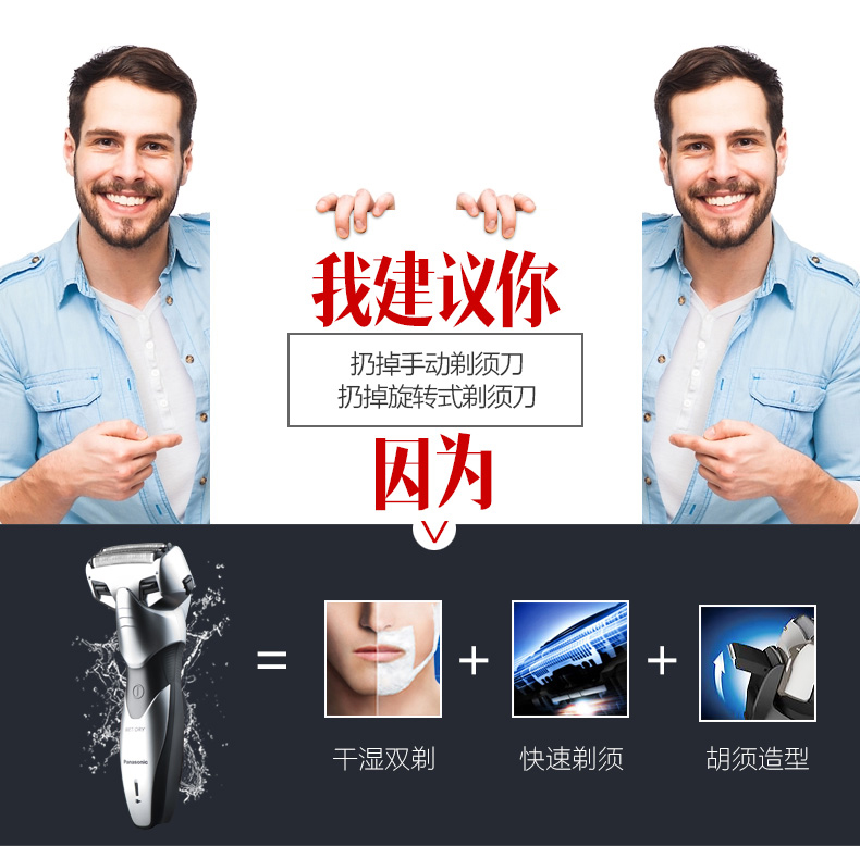 这种往复式的电动剃须刀更适合胡子粗硬的朋友,能比旋转式的刮得更干净,松下和博朗是往复式电动剃须刀的标杆,买这两个品牌不会错。