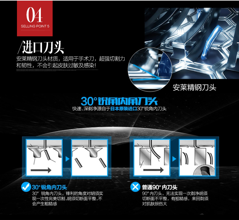 刀片是以日本安莱钢为原料,加上日本制刀工艺技术制成的;还有Smart Senser胡须浓密智能感应功能,可以能根据胡须的浓密自动调节力度,减轻皮肤的负担;