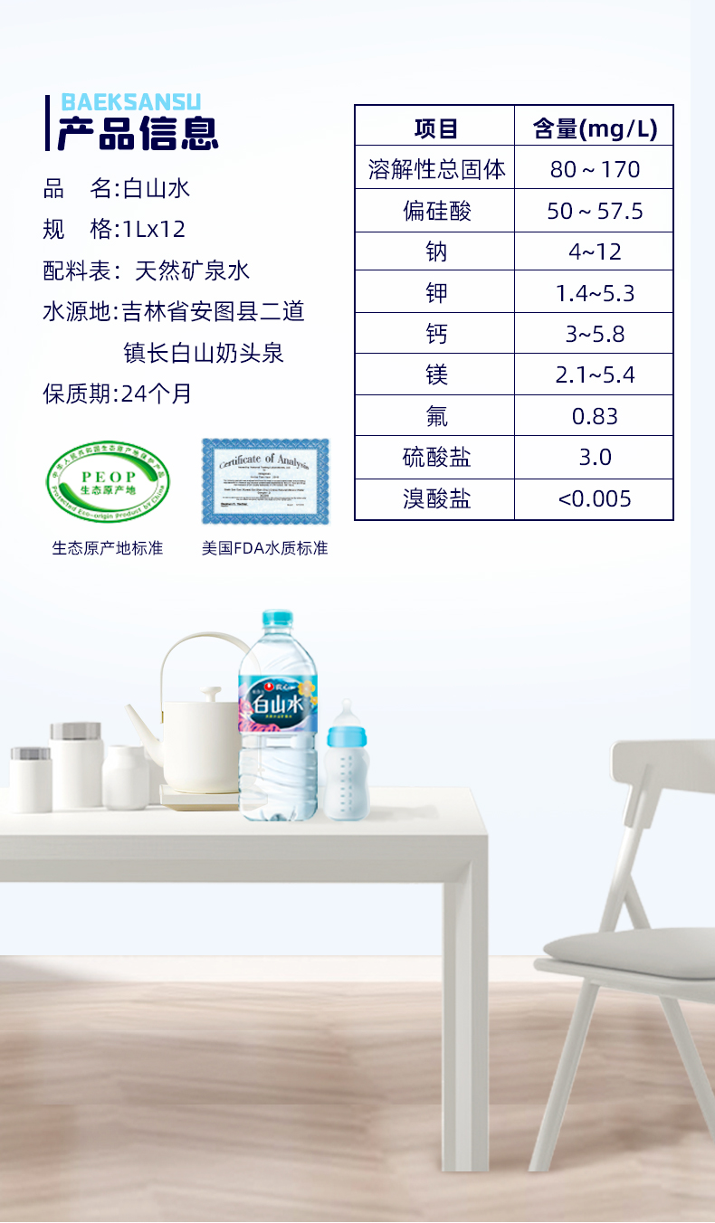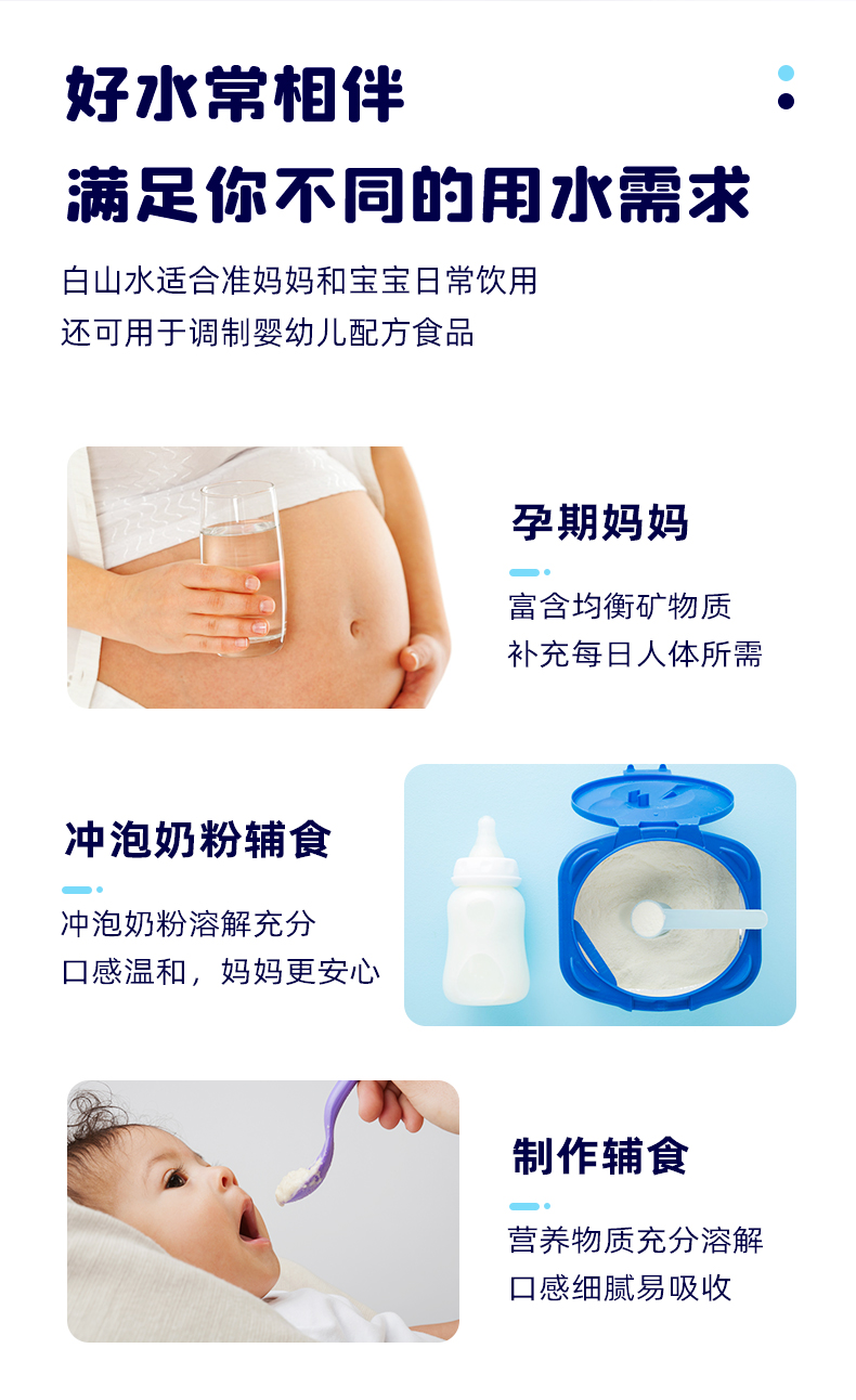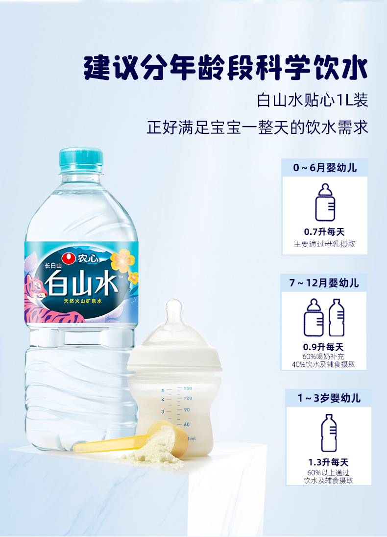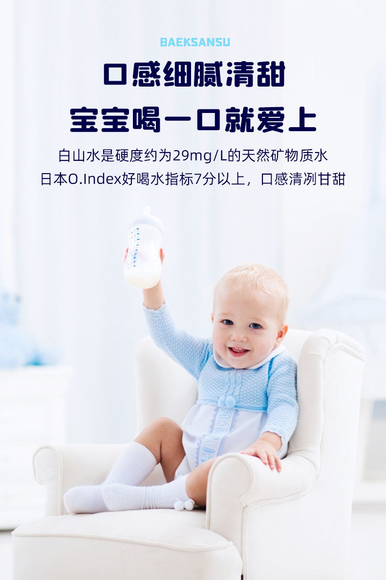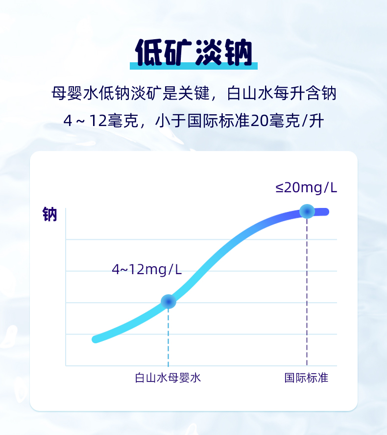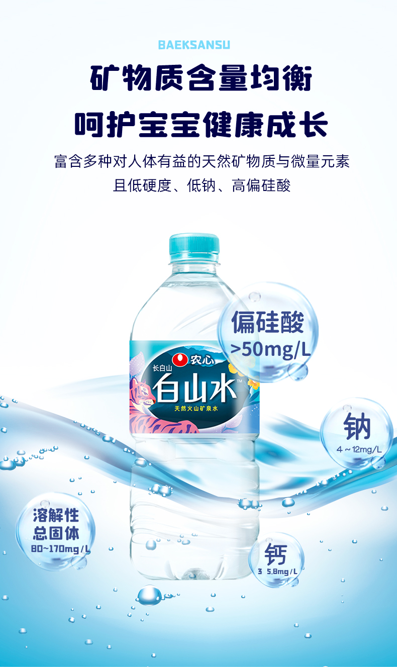 这款农心 白山水 天然纯净矿物质水,是源自长白山的天然火山矿泉水,特点是低矿淡钠(含钠4~12mg/L),小于国际标准的20mg/L,富含偏硅酸,适合婴幼儿日常饮用。