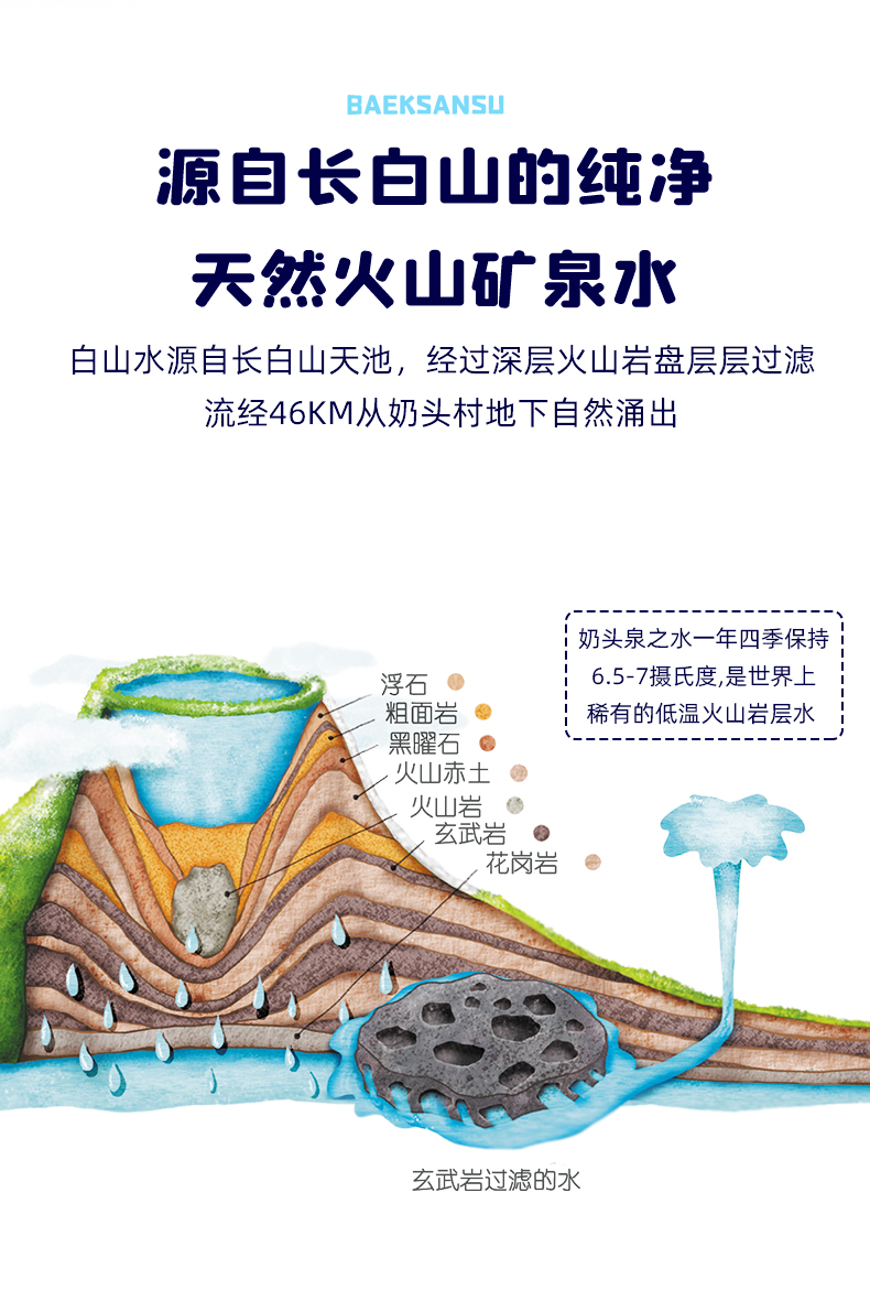 源于长白山天池的新鲜水源,长白山是目前还有火山活动的活火山,蕴含非常丰富的矿物质,水源经过低温盐盘层层过滤,是健康的天然软水,口感甘甜顺滑,有助于帮助人体进行代谢,常饮用有益身体健康。