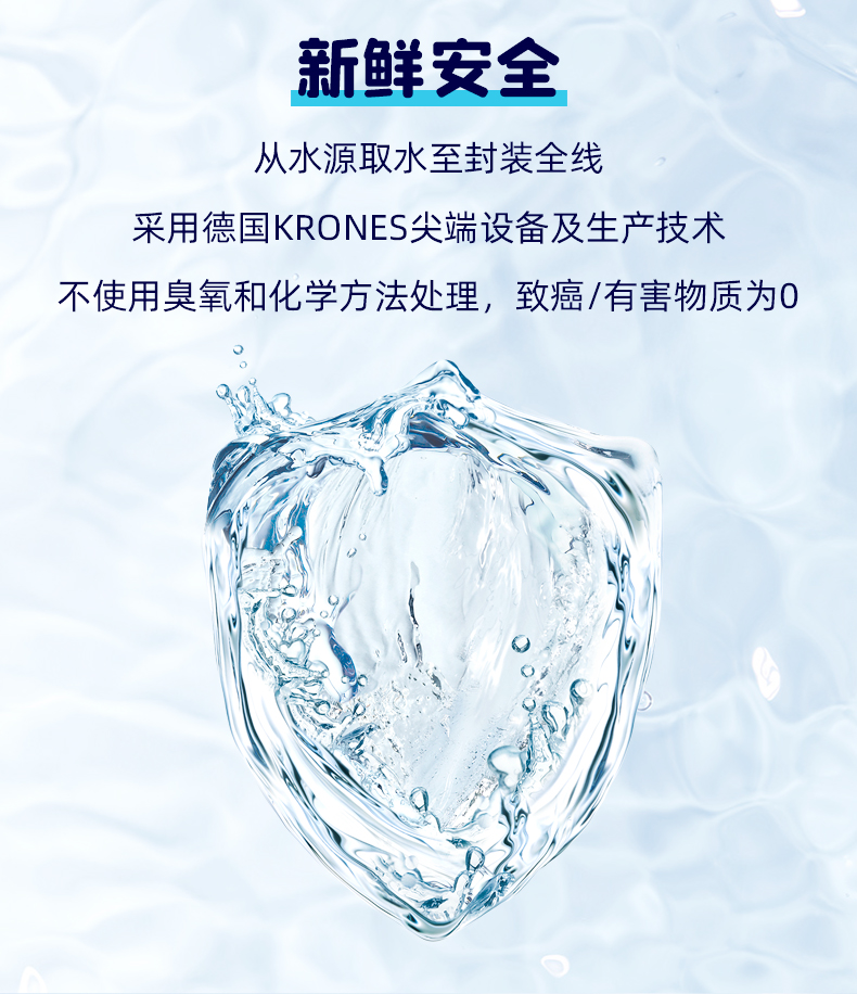 从水源取水至封装全线采用德国KRONES尖端设备及生产技术,不使用臭氧和化学方法处理,致癌/有害物质为零。