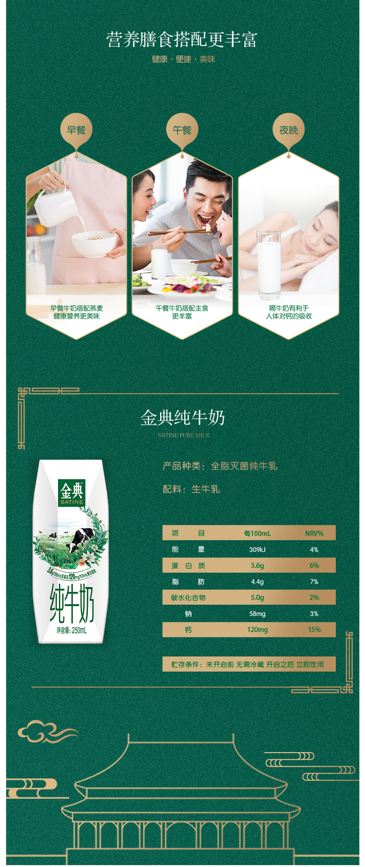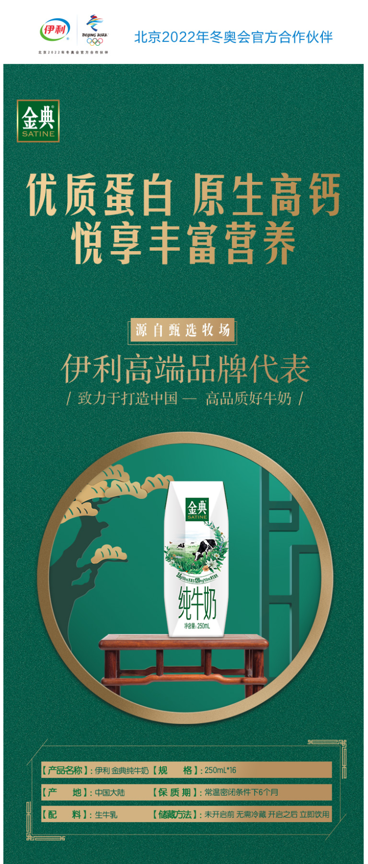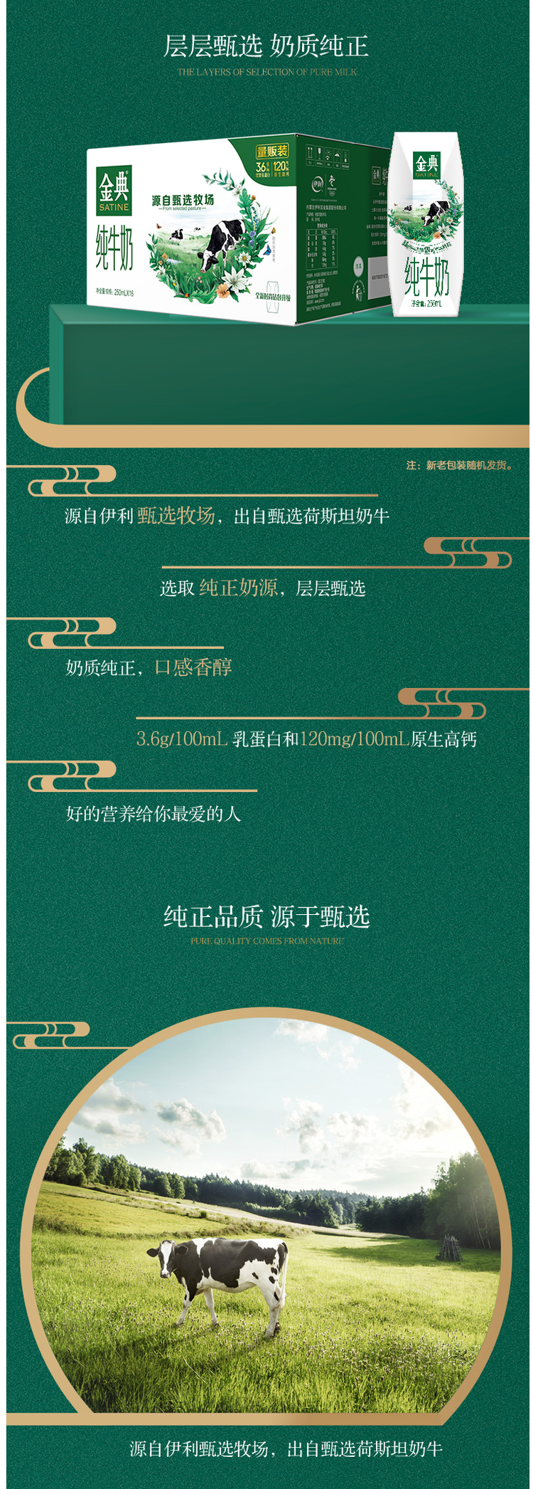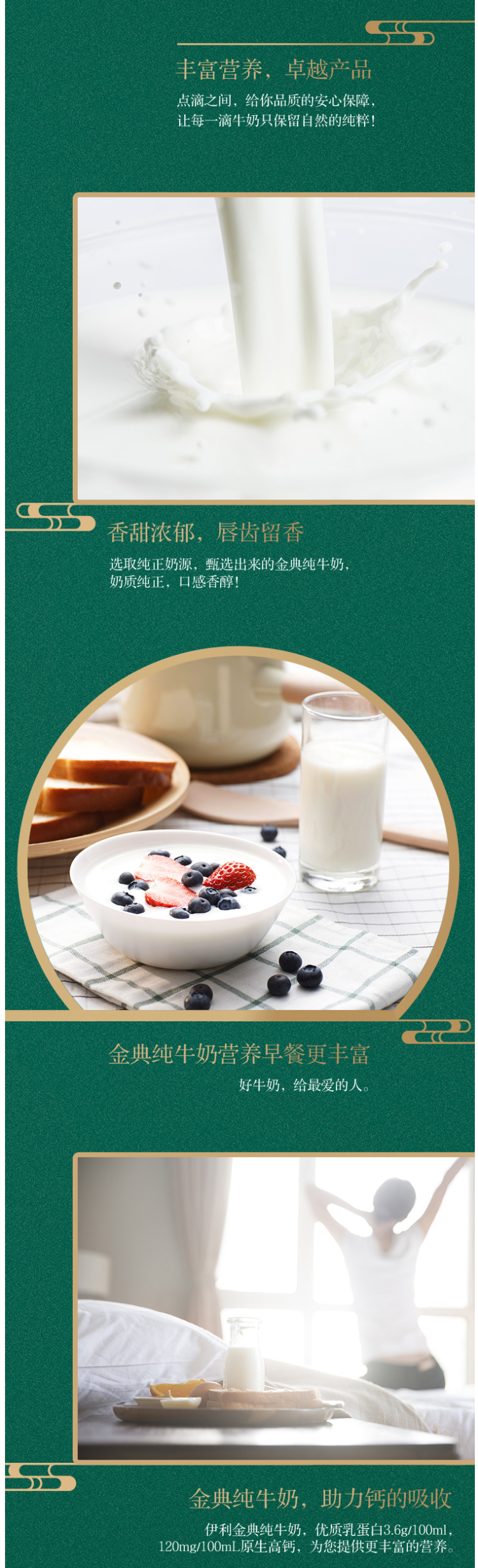 这款金典牛奶源自伊利甄选牧场,奶源无污染,确保绿色健康,每100ml含优质乳蛋白3.6g、原生高钙120mg,营养丰富,唇齿留香。
