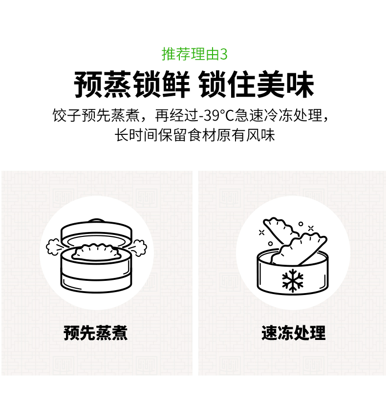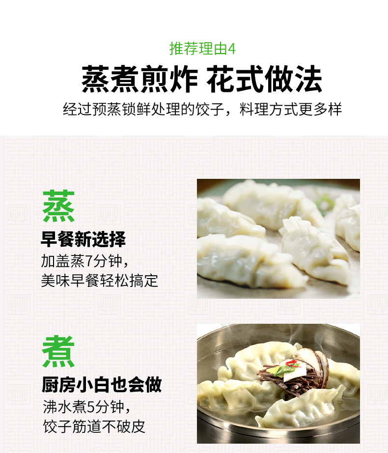 2.是熟冻的,意思是煮半熟后再冻起来的,自己煮的话比较容易熟,还能蒸煎炸都行,吃法多样,不需要专门买蒸饺或者煎饺了。
