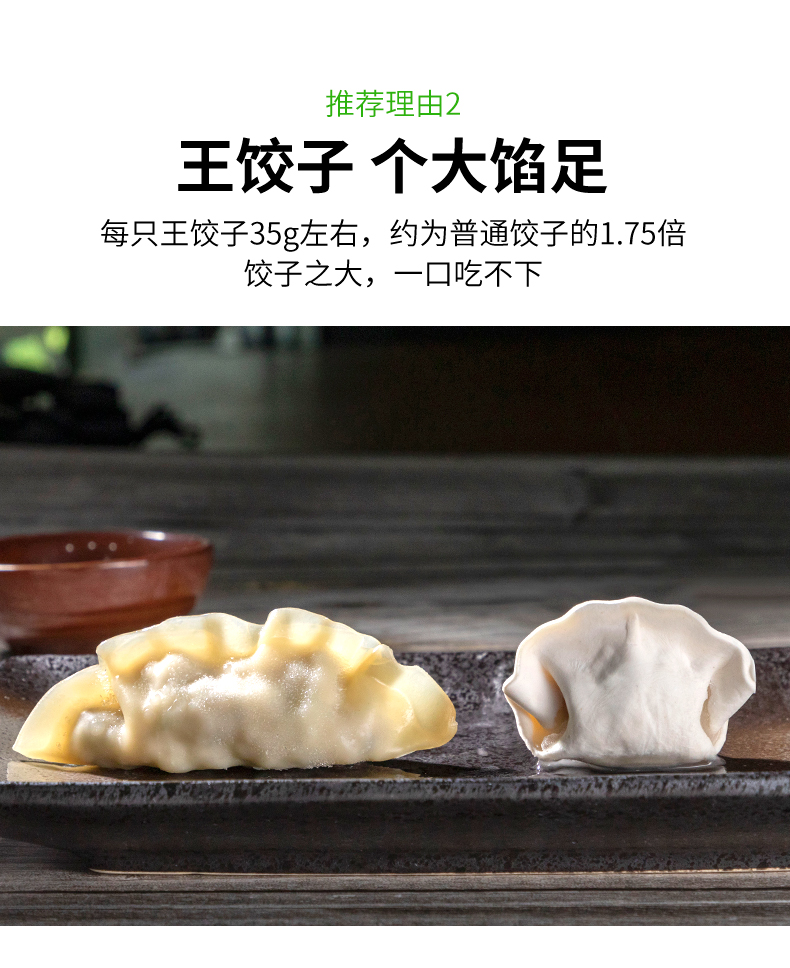 1.个头大,单只有35g,是一般饺子的1.75倍,日常500g的思念或者三全,我要一袋半才能吃饱,这个一袋就行,可能是给胃形成了错觉吧,吃了这么多。