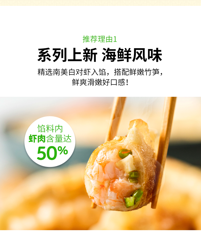 还有最新推出的海鲜风味,虾仁王饺子,精选南美白对虾入馅,搭配鲜嫩竹笋,鲜爽滑嫩好口感!