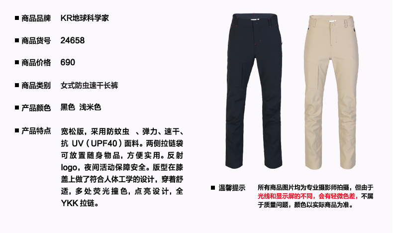 地球科学家这款速干裤,使用的是No Fly Zone除虫菊酯,是美国疾病预防控中心认定有效的驱蚊成分,除了驱蚊,对蚂蚁、苍蝇等昆虫也都有效,并且效果可保持洗涤70次。