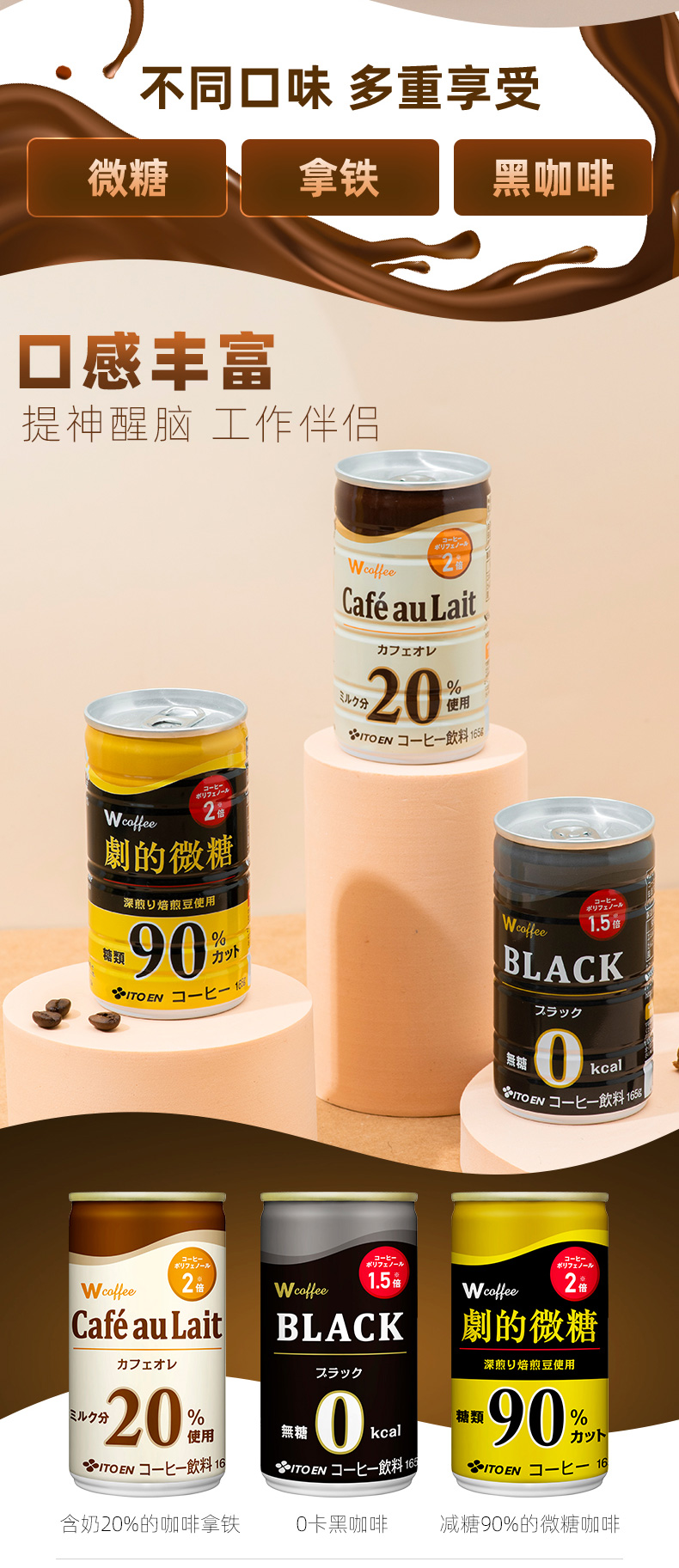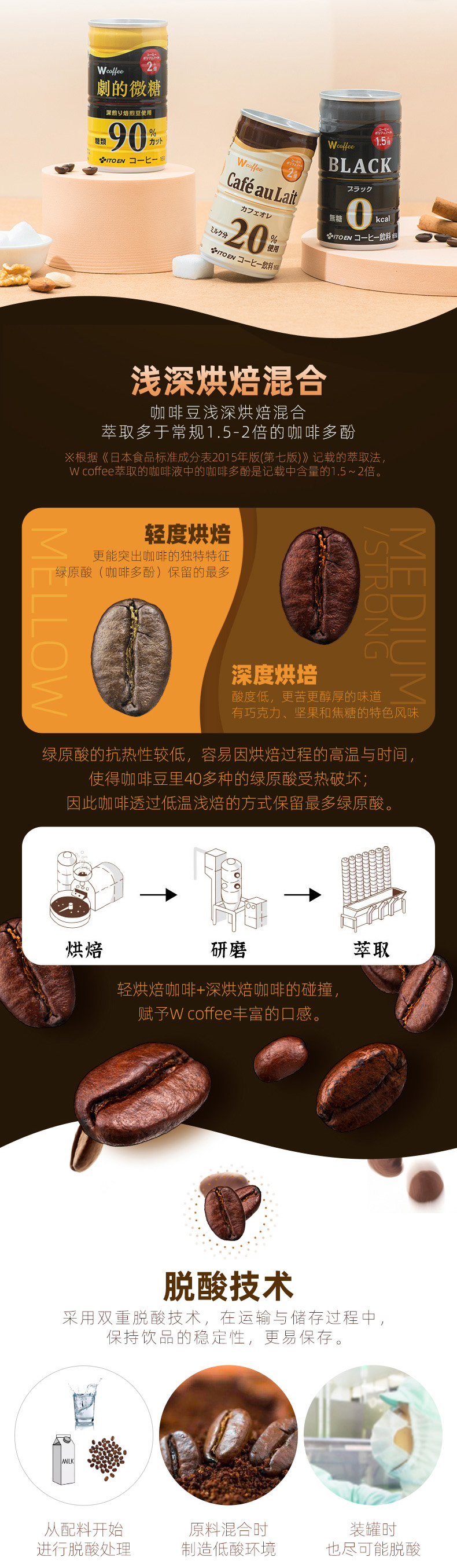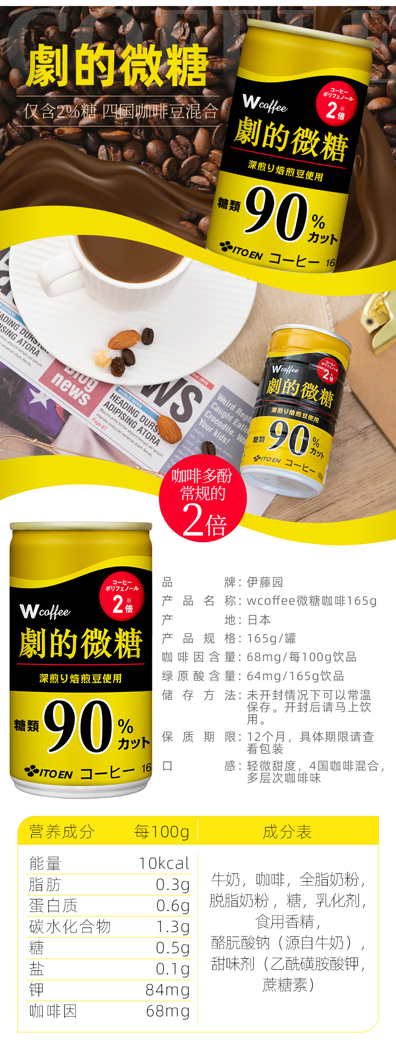 这款伊藤园ITOEN低糖咖啡,日本进口,咖啡豆采用浅深烘焙混合,萃取多于常规1.5-2倍的咖啡多酚,多重功效,口感丰富,健康美味兼具;采用双重脱酸技术,保持饮品的稳定性,媲美现磨口感,165g小体积,方便携带,随时随地来一罐。