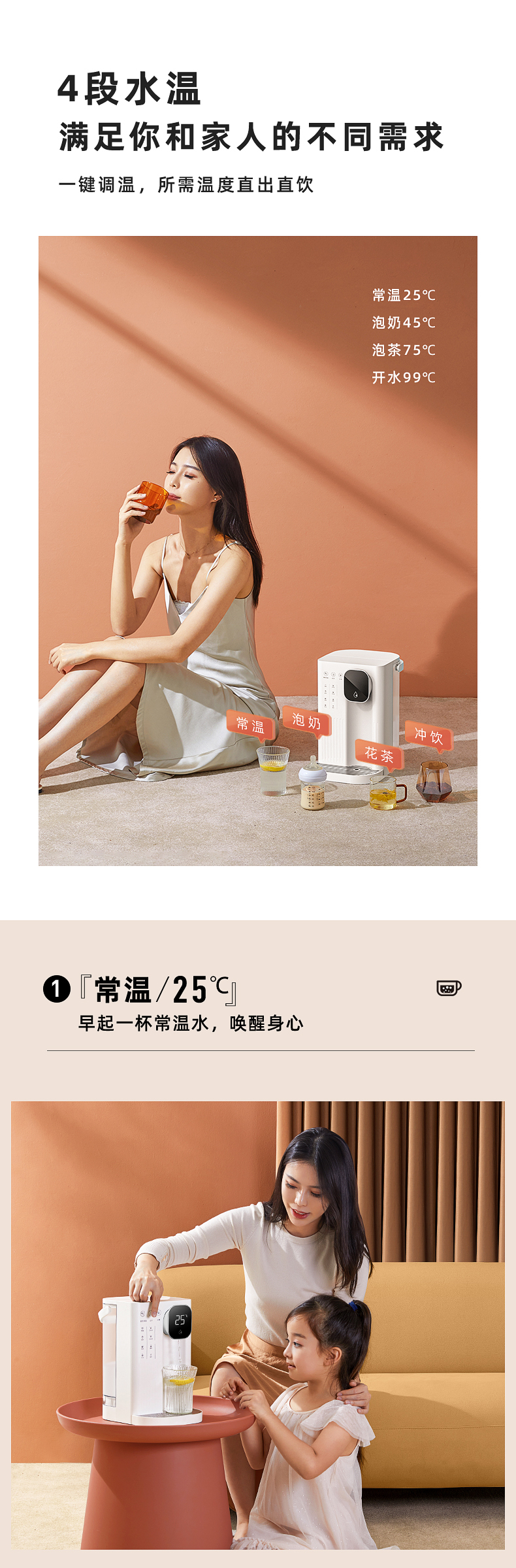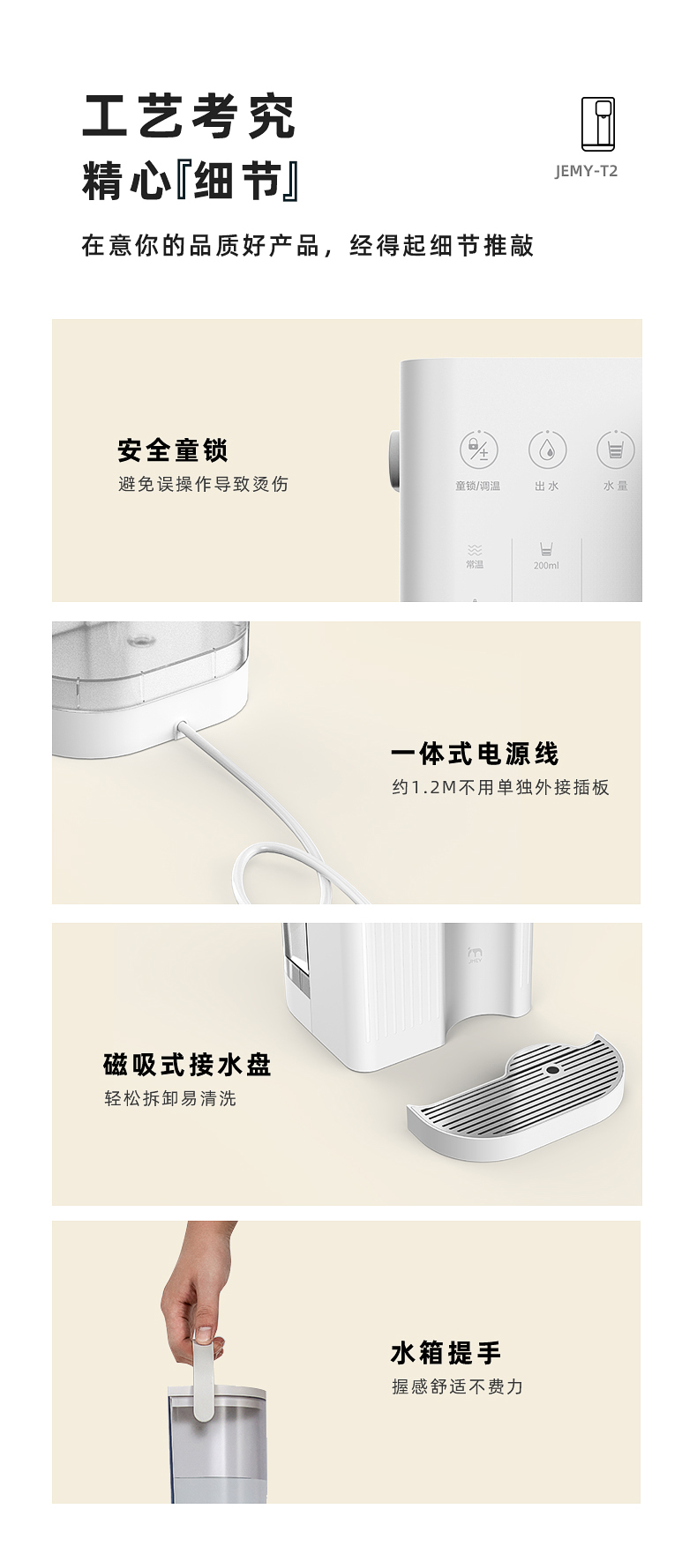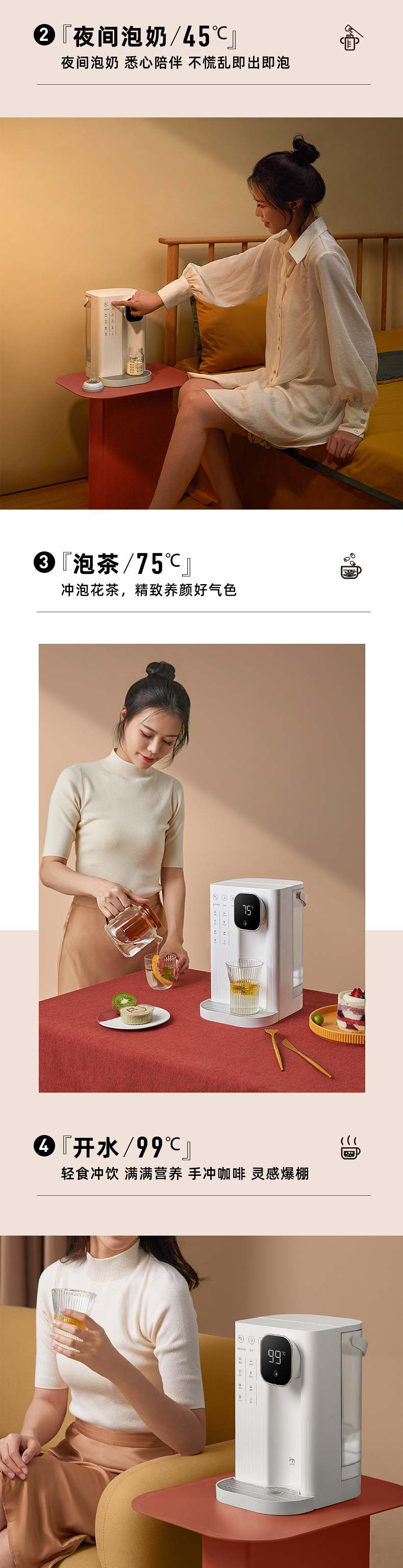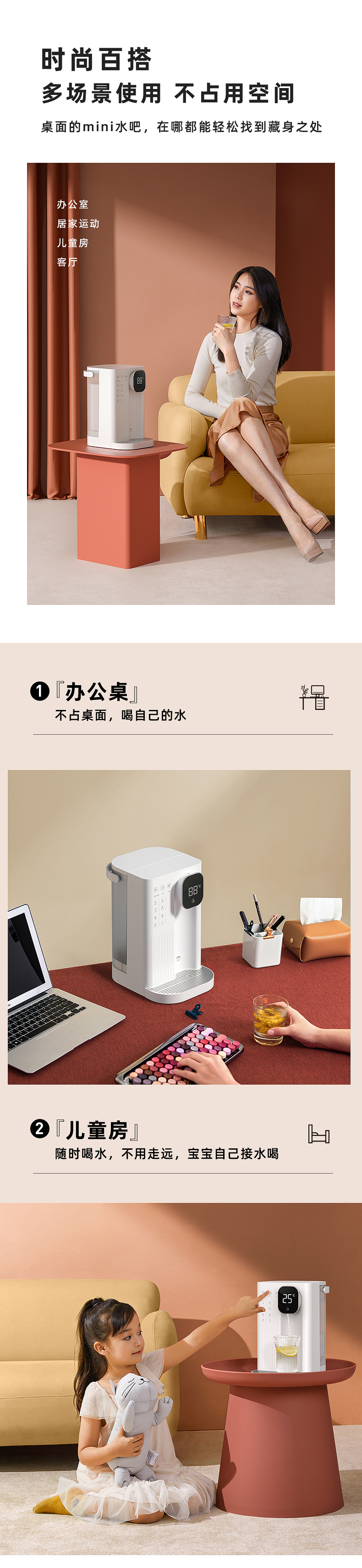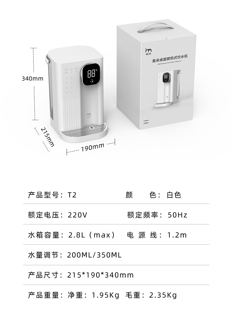 集米即热饮水吧,1秒即热,现烧现喝新鲜热水。拥有4档水温可选,LED智能显示,泡茶、泡奶粉、泡蜂蜜均可以找到适宜的温度。迷你机身,方便移动,满足厨房,卧室,浴室不同场景需求,磁吸式接水盘,使用方便。