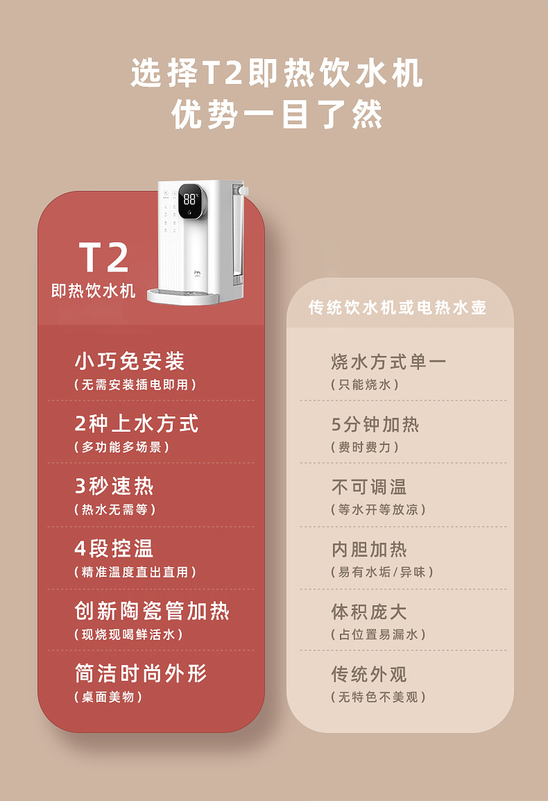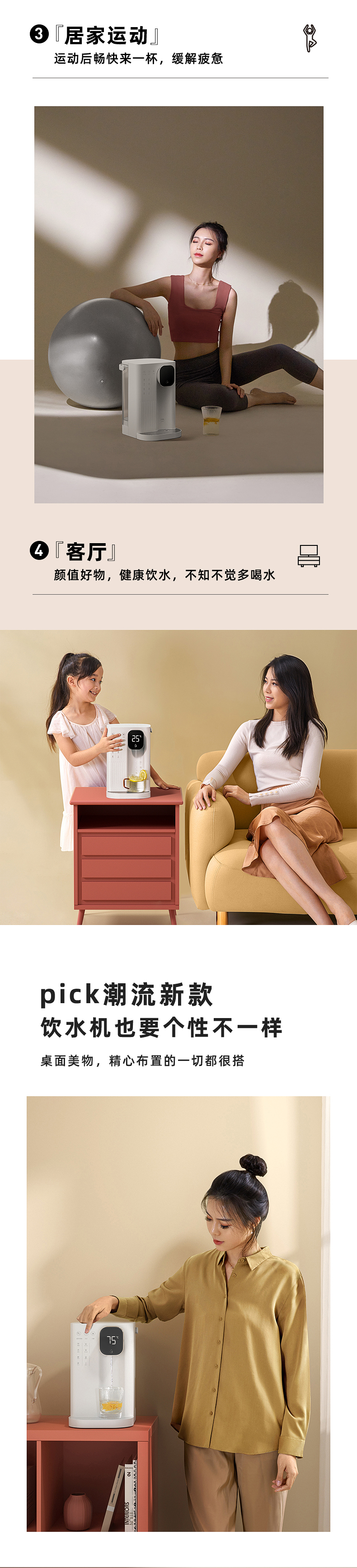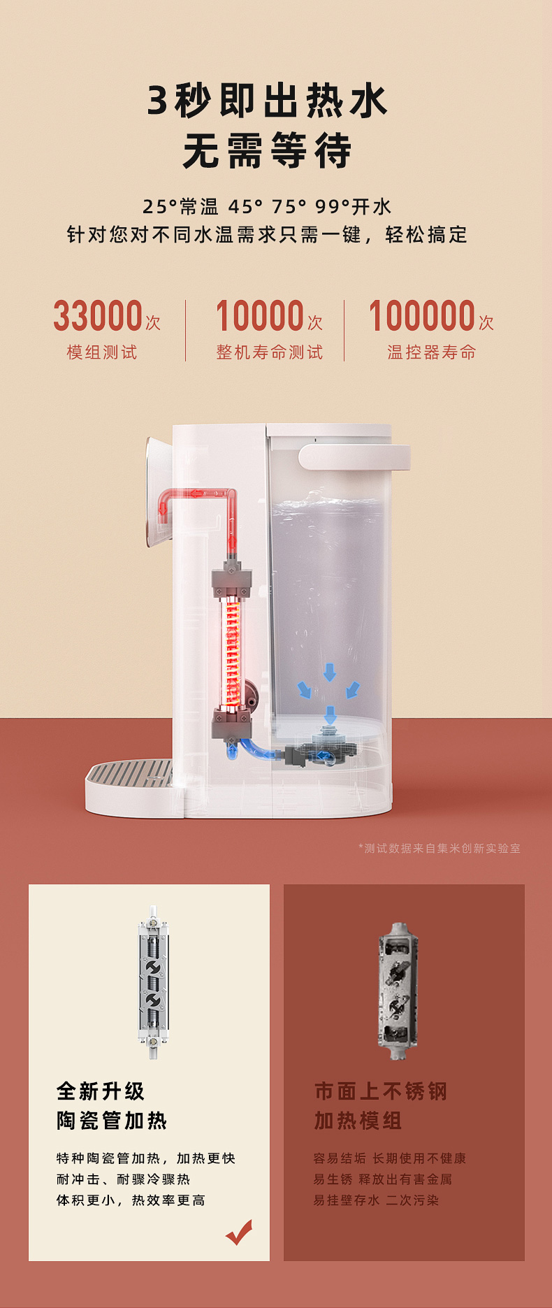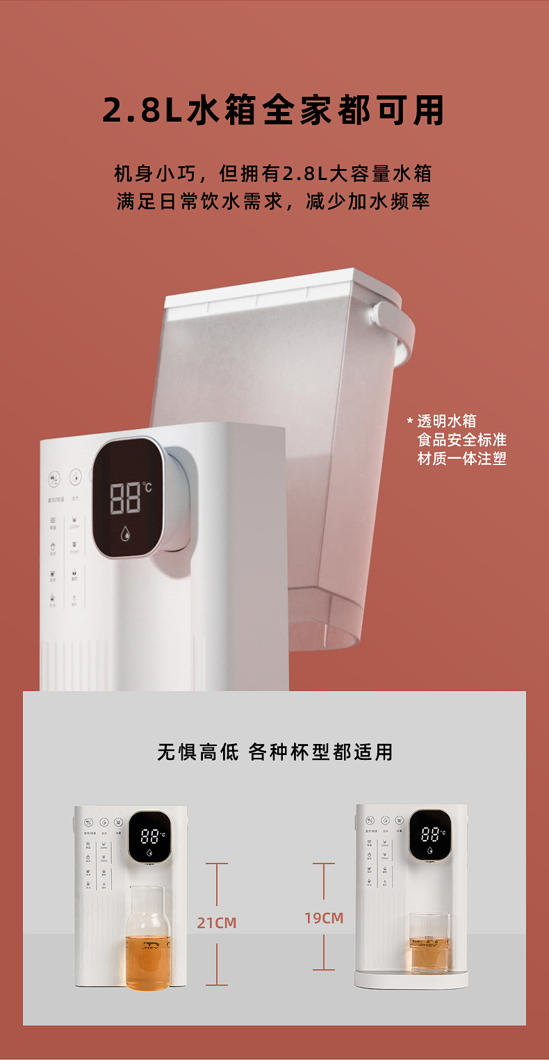 集米即热饮水吧,1秒即热,现烧现喝新鲜热水。拥有4档水温可选,LED智能显示,泡茶、泡奶粉、泡蜂蜜均可以找到适宜的温度。迷你机身,方便移动,满足厨房,卧室,浴室不同场景需求,磁吸式接水盘,使用方便。