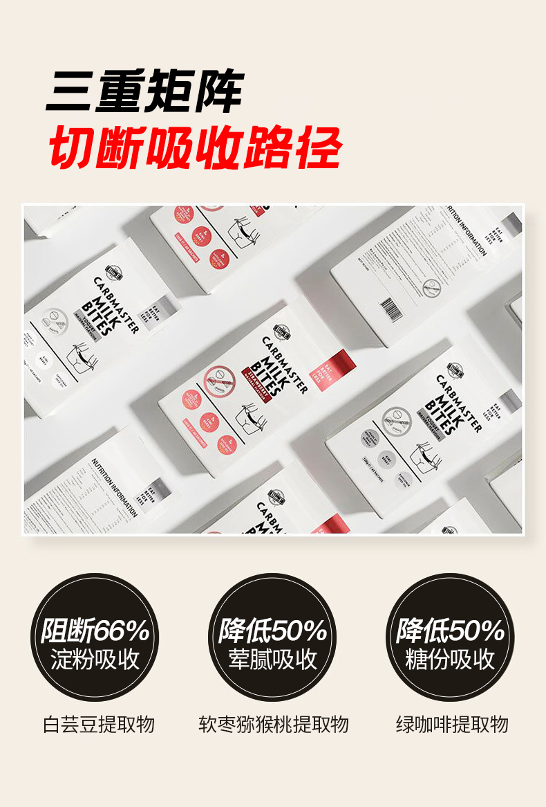 主要成分白芸豆提取物-阻断66%淀粉吸收、软枣猕猴桃提取物-降低50%荤腻吸收、绿咖啡提取物-降低50%糖分吸收,三重矩阵切断人体吸收路径,同时红花籽提取物-温和降低食欲。