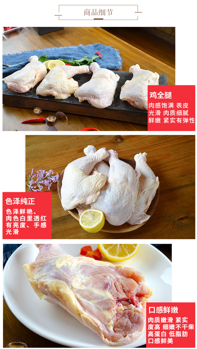 每袋2斤约3-5个装。此款为鸡全腿,肉质细嫩有弹性,不干不柴,低脂肪高蛋白,口感鲜嫩,可红烧、可油炸、可烧烤。