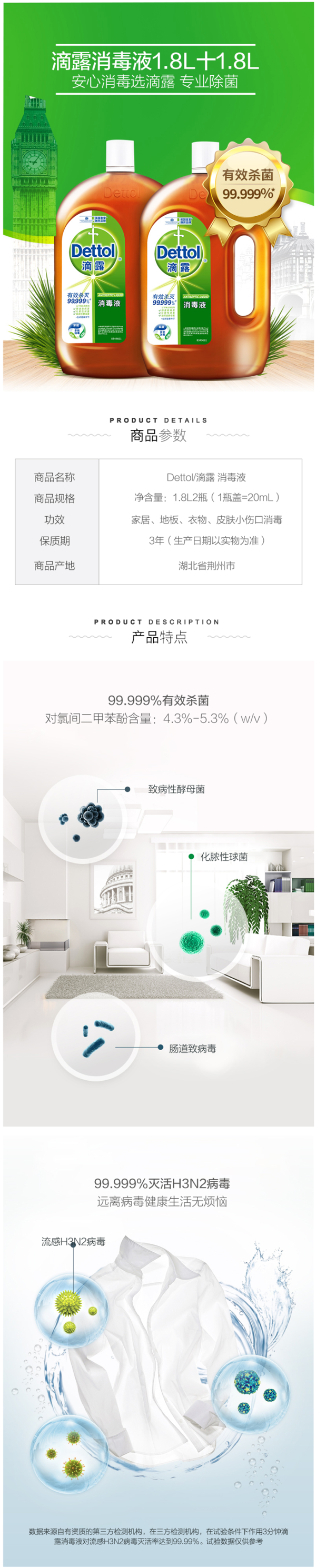 这款滴露 杀菌消毒液,主要有效成分是PCMX,可有效杀灭99.999%的大肠杆菌、金黄色葡萄球菌等有效细菌,含有清香松油,淡淡清香;可兑水用于伤口消毒,也可以用于地板消毒、衣物消毒、家居消毒等。