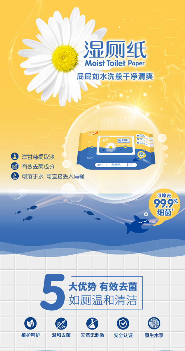 采用进口原生木浆,如棉柔软,柔韧结实,6道过滤EDI纯水、无酒精、无香精、不添加可迁移荧光剂、富含洋甘菊精华、芦荟提取物、水润抗敏温柔呵护肌肤,可溶于水,可直接丢入马桶。规格:150*200mm。