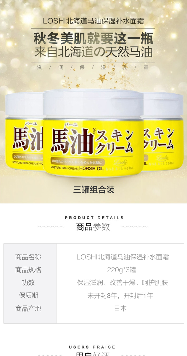 来自日本北海道的礼物,天然马油利用蒸汽洗药方法提炼而成,主要成分为油酸、亚油酸和棕榈酸,其中油酸和亚油酸的总含量为50%。天然配方马油、乳木果油、甘油、蛇麻草、迷迭香、柠檬、松等,无乳化、无香料、无着色,质地轻盈。吸收快、不油腻、宝宝与敏感肌也可使用。