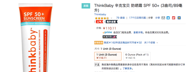 这款Thinkbaby防晒霜在美亚是是货真价实的爆款,常年霸占儿童防晒霜的前几名,而且评分高达4.3分,很靠谱的一款产品。