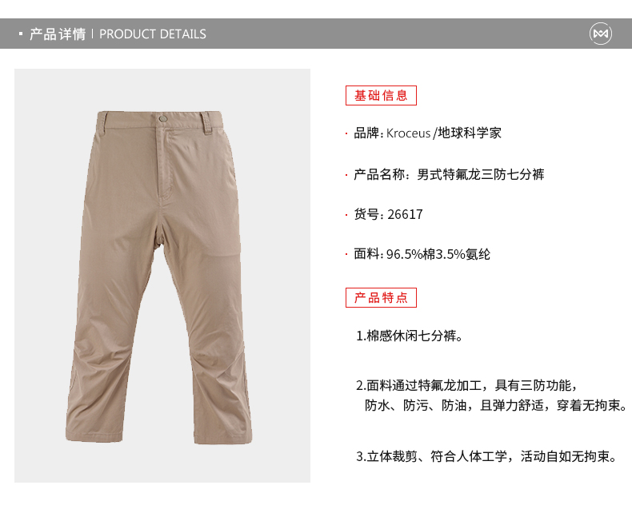 这款地球科学家男休闲裤,使用96.5%棉+3.5%氨纶弹力混纺而成,摸起来的手感绵软也能吸湿,还经过特氟龙的加持,具有防水防油防污的优点,且有弹力,上身不紧绷。