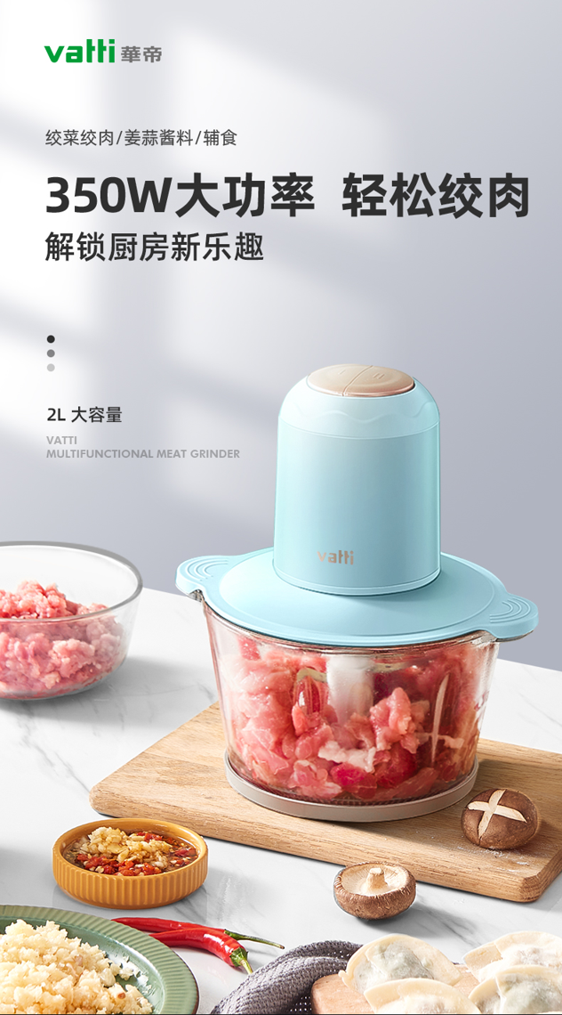 华帝绞肉机,绞肉、绞馅、剁辣椒一机多能,比市面上其他的绞肉机功率要大,绞肉更快更有劲,双层四维刀片,两档调节,随心控制,不锈钢接口,安全可靠,大容量满足全家需求,加厚玻璃碗便于清洗,打肉只需30秒,料理达人必备~