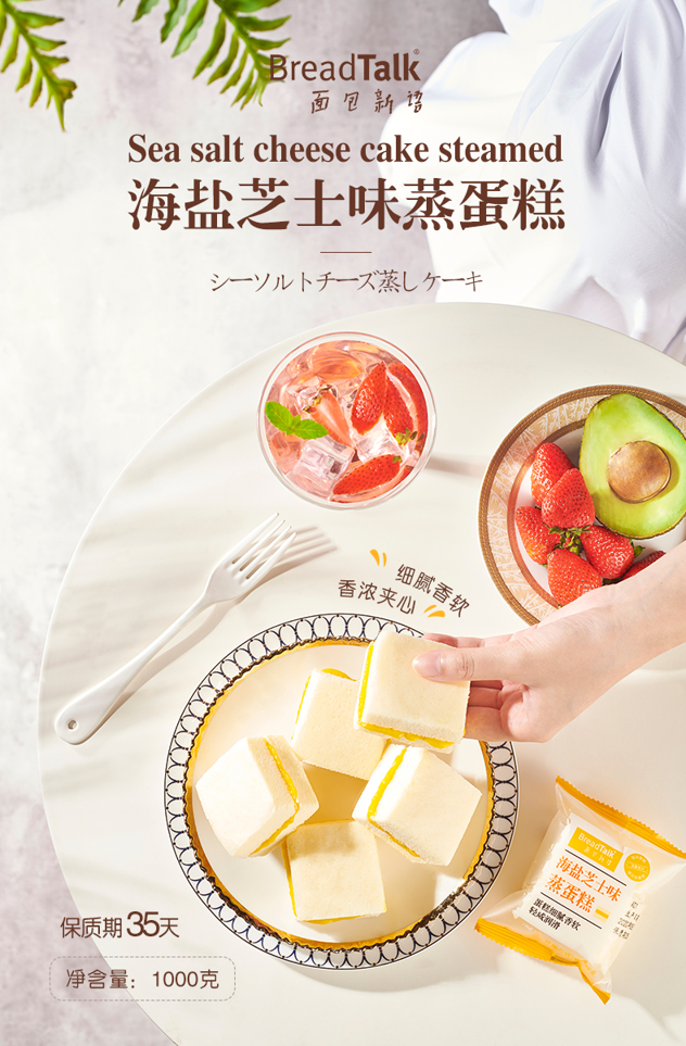 这款面包新语 海盐芝士味蒸蛋糕,规格:1000g,甄选优质阳光小麦粉、全蛋液,海盐芝士 ,白砂糖,采用低温蒸制工艺,锁住营养,减少营养流失;细腻香软,轻咸润滑。