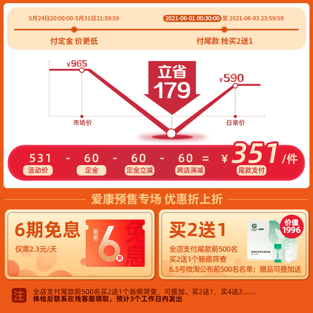 天猫商城爱康国宾婚检体检卡套餐售价531元,预付定金60元可减60元,6月1号 00:30支付尾款471元,再领取商品页面每满200-30元优惠券,到手431元。有需求的朋友可以考虑入手~