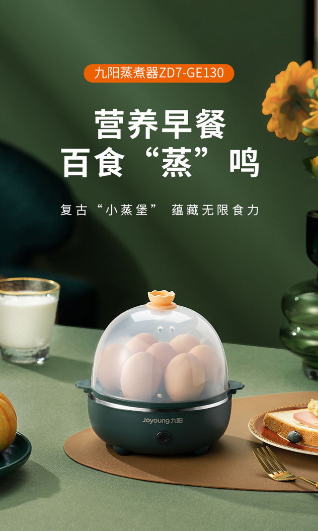 九阳多功能煮蛋器,采用蒸汽立体循环加热技术,加热速度快,更均匀,保留食材原汁原味,防干烧,温度过高自动断电、水干自动断电,可加热玉米、鸡蛋、馒头、包子等,轻松搞定早餐。