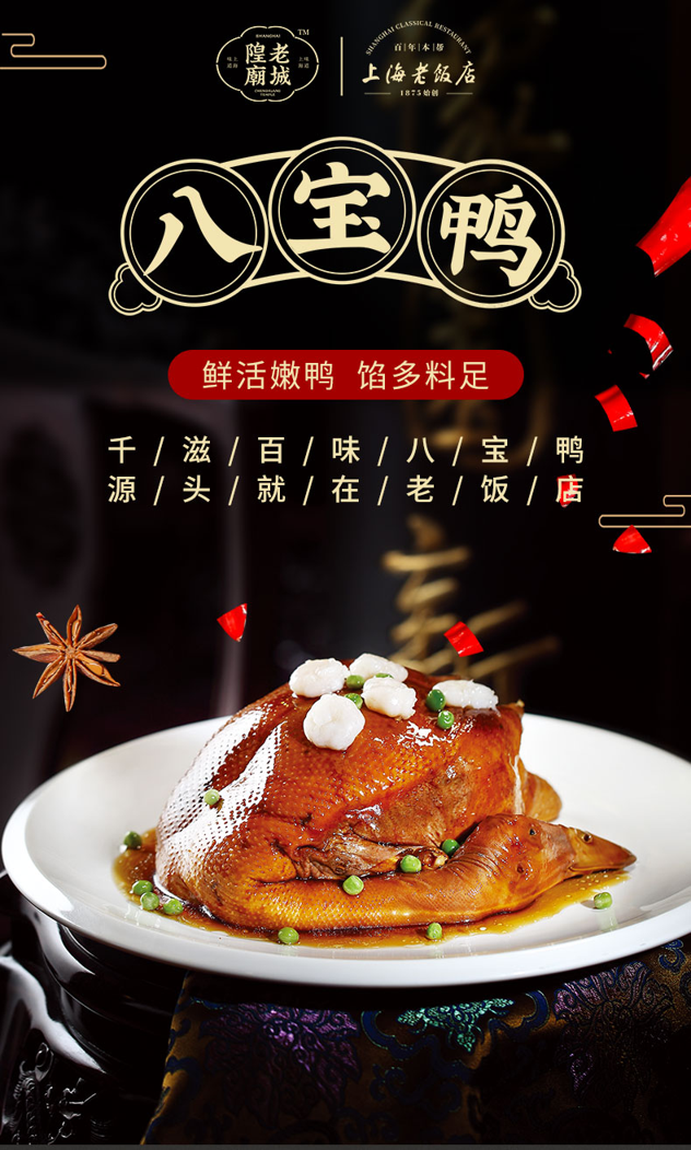 其中“八宝鸭”在国内外的烹饪大赛中多次获得金牌,鸭子选用肥壮的新草鸭,肚子内放入栗子、白果、肫丁、腿肉、糯米、干贝素、冬笋等配料,经过蒸焖后,主副料相互渗透,鸭肉酥香,配料糯软,风味独特。