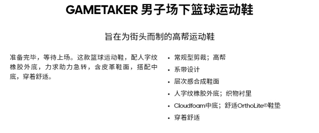 这款阿迪达斯Adidas GAMETAKER 男休闲篮球运动鞋,高帮款式,鞋面是合成皮革制成的,轻便舒适透气。鞋垫是OrthoLite抗菌除臭鞋垫,透气、脚感松软,有一定的缓震效果。鞋底是Cloudfoam材料中底+橡胶外底组成,轻质柔软,搭配三角断纹,防滑耐磨。